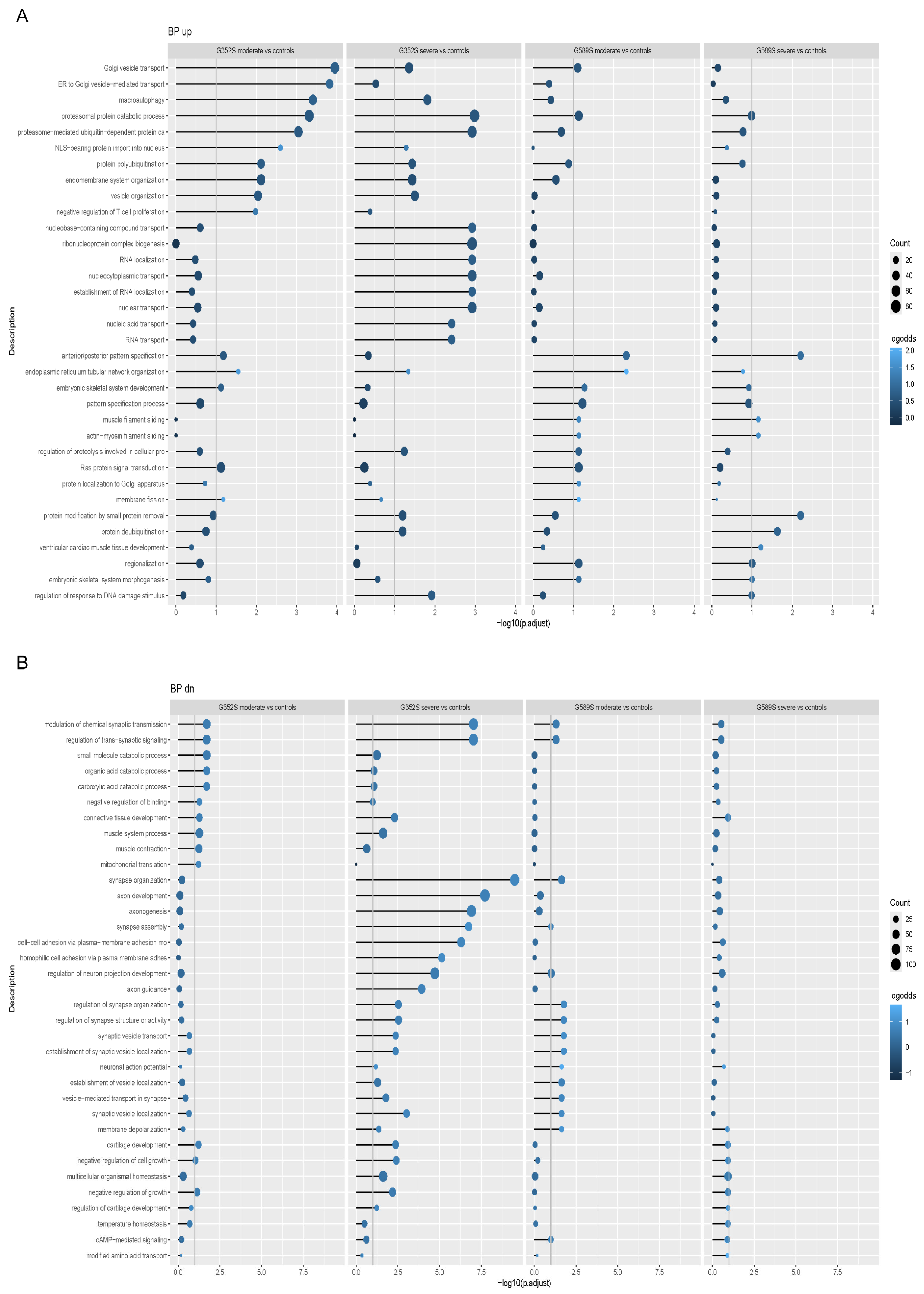 Figure 2. RNA-Seq signaling pathways in human dominant OI osteoblasts. Functional enrichment analysis showing the enriched Gene Ontology (GO) terms in the Biological Process ontology within (A) upregulated genes and (B) downregulated genes in osteoblasts with the G352S substitution from the type IV OI patient, osteoblasts with the G352S substitution from the type III OI patient, osteoblasts with the G589S substitution from the type IV OI patient, and osteoblasts with the G589S substitution from the type III OI patient compared to control osteoblasts. Color indicates a fraction of upregulated/downregulated genes annotated with the term.