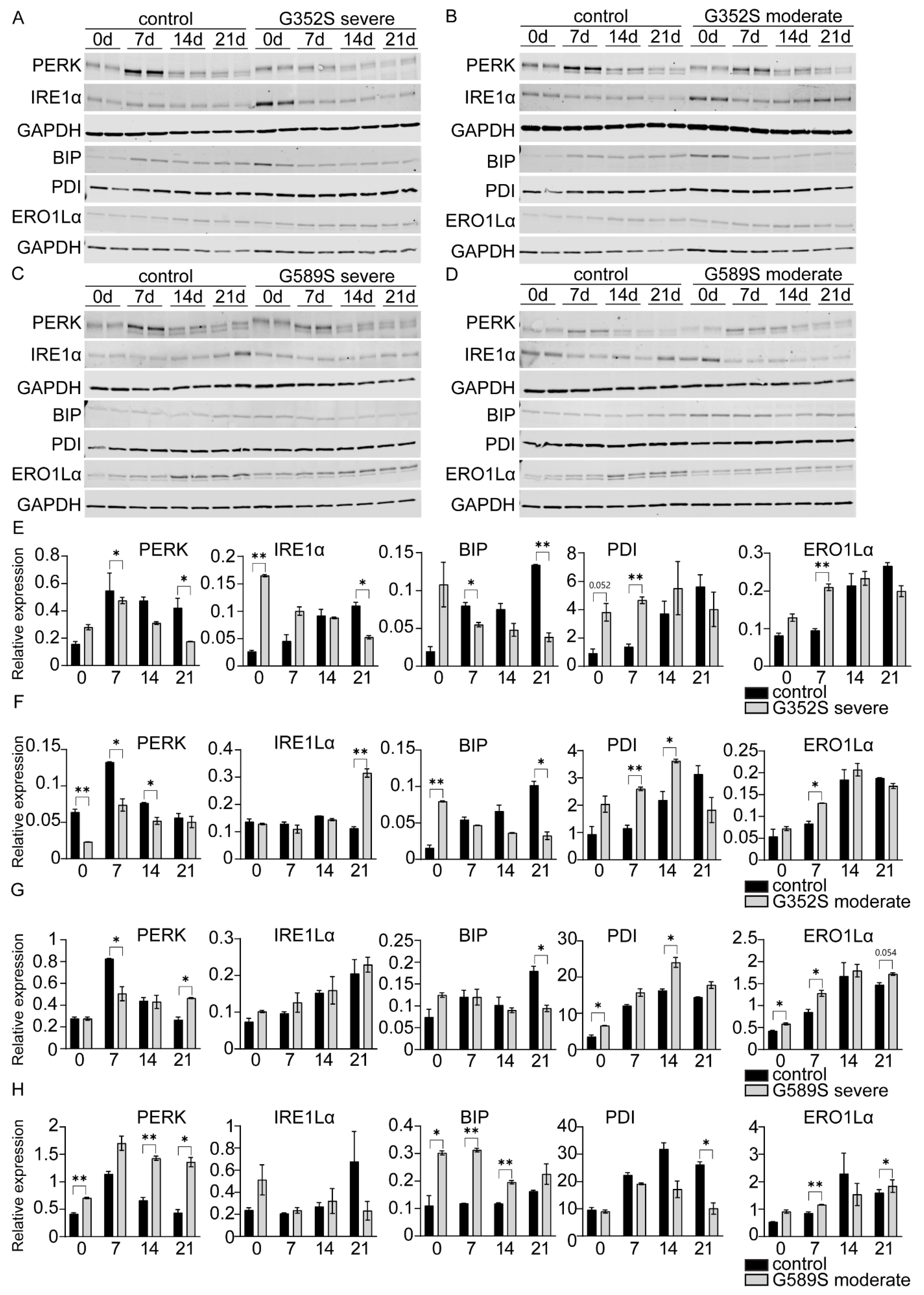 Figure 5. Altered UPR signaling pathway in osteoblasts from dominant human OI. (A) Western blots of PERK, IRE1α, BIP, PDI, and ERO1Lα in control osteoblasts and (A) osteoblasts with the G352S substitution from the type III OI patient, (B) osteoblasts with the G352S substitution from the type IV OI patient, (C) osteoblasts with the G589S substitution from the type III OI patient, and (D) osteoblasts with the G589S substitution from the type IV OI patient at Day 0, 7, 14, and 21 of differentiation followed by (EH) quantification of corresponding protein levels normalized to GAPDH. GAPDH was used as a loading control. Data are presented as means ± SEM. * p < 0.05, ** p < 0.01.