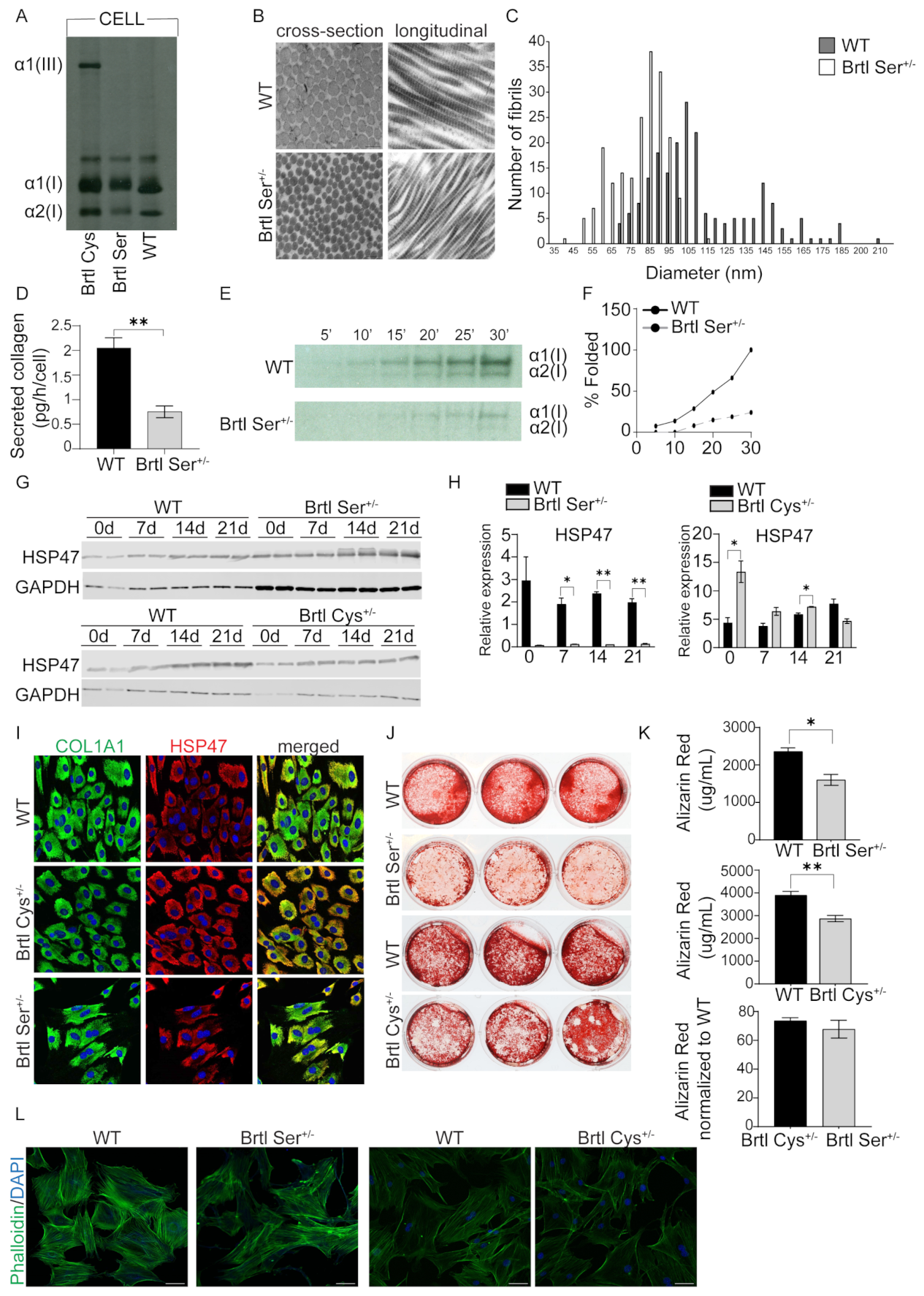 Figure 8. Comparison of molecular changes between Brtl Ser and Brtl Cys osteoblasts. (A) Type I collagen from cell layer of WT, Brtl Cys, and Brtl Ser calvarial osteoblasts was electrophoresed on 5% SDS-Urea-PAGE. (B) Cross-sections and longitudinal sections of dermal fibrils in 7-week-old Brtl Ser and its WT littermate. Scale bars, 0.2 µm. (C) Quantification of dermal fibrils. (D) Quantification of secreted collagen from 24 h collected media from Brtl Ser and WT calvarial osteoblasts. (E) Intracellular folding of type I collagen in calvarial Brtl Ser and WT osteoblasts. (F) Quantification of intracellular folded type I collagen. (G) Western blots of HSP47 protein in Brtl Ser and Brtl Cys calvarial osteoblasts compared to WT calvarial osteoblasts at Day 0, 7, 14, and 21 of differentiation followed by (H) quantification of corresponding protein levels normalized to GAPDH. GAPDH was used as a loading control. (I) Immunocytochemistry of α1(I) collagen (green) and HSP47 (red) in WT, Brtl Cys, and Brtl Ser calvarial osteoblasts. DAPI was used as a counterstain. (J) Alizarin Red staining of calvarial osteoblasts in technical triplicates from Brtl Ser and Brtl Cys mice compared to corresponding WT. (K) Quantification of Alizarin Red staining by hydrochloric acid extraction of Brtl Ser and Brtl Cys calvarial osteoblasts compared to WT, as well as normalized quantification of each mutant to its corresponding WT. (L) Phalloidin staining (green) of actin filaments in Brtl Ser and Brtl Cys calvarial osteoblasts and its corresponding WT. DAPI was used for nuclei staining. Scale bars, 50 µm. Data are presented as means ± SEM. * p < 0.05, ** p < 0.01.