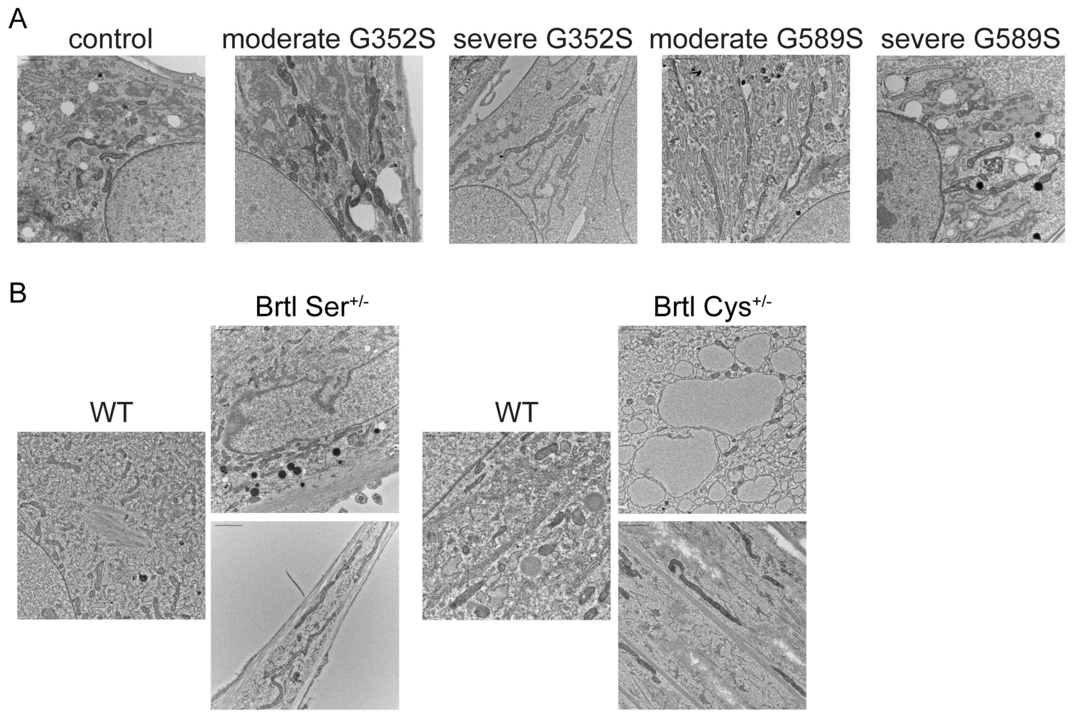 Recent studies by our group [15] showed for the first time that recessive OI osteoblasts exhibited changes in mitochondrial function in terms of fusion and fission processes that affected the morphology of mitochondria and superoxide production by mitochondria. Due to possible involvement of ER stress in phenotypic variability (Figure 5 and Figure 8), we investigated whether ER stress affected mitochondrial function in patient and murine osteoblasts. Electron microscopy showed elongated mitochondria with evident cristolysis in patient osteoblasts compared to control (Figure 9A). Brtl Ser and Brtl Cys osteoblasts also displayed elongated mitochondria, as seen in human osteoblasts (Figure 9B). These data indicate that mitochondrial dysfunction may be a common cellular feature of OI.