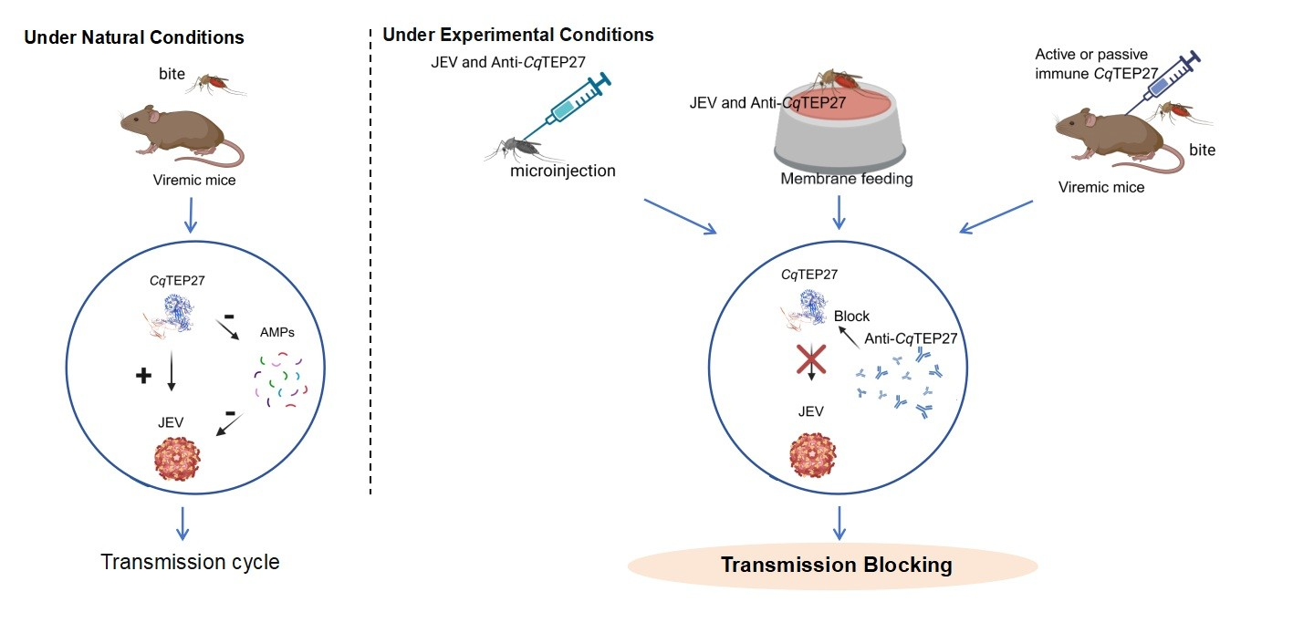 2.6. The Vaccine-Induced Immunity of CqTEP27 Disrupts the Transmission Cycle of JEV in C. quinquefasciatus