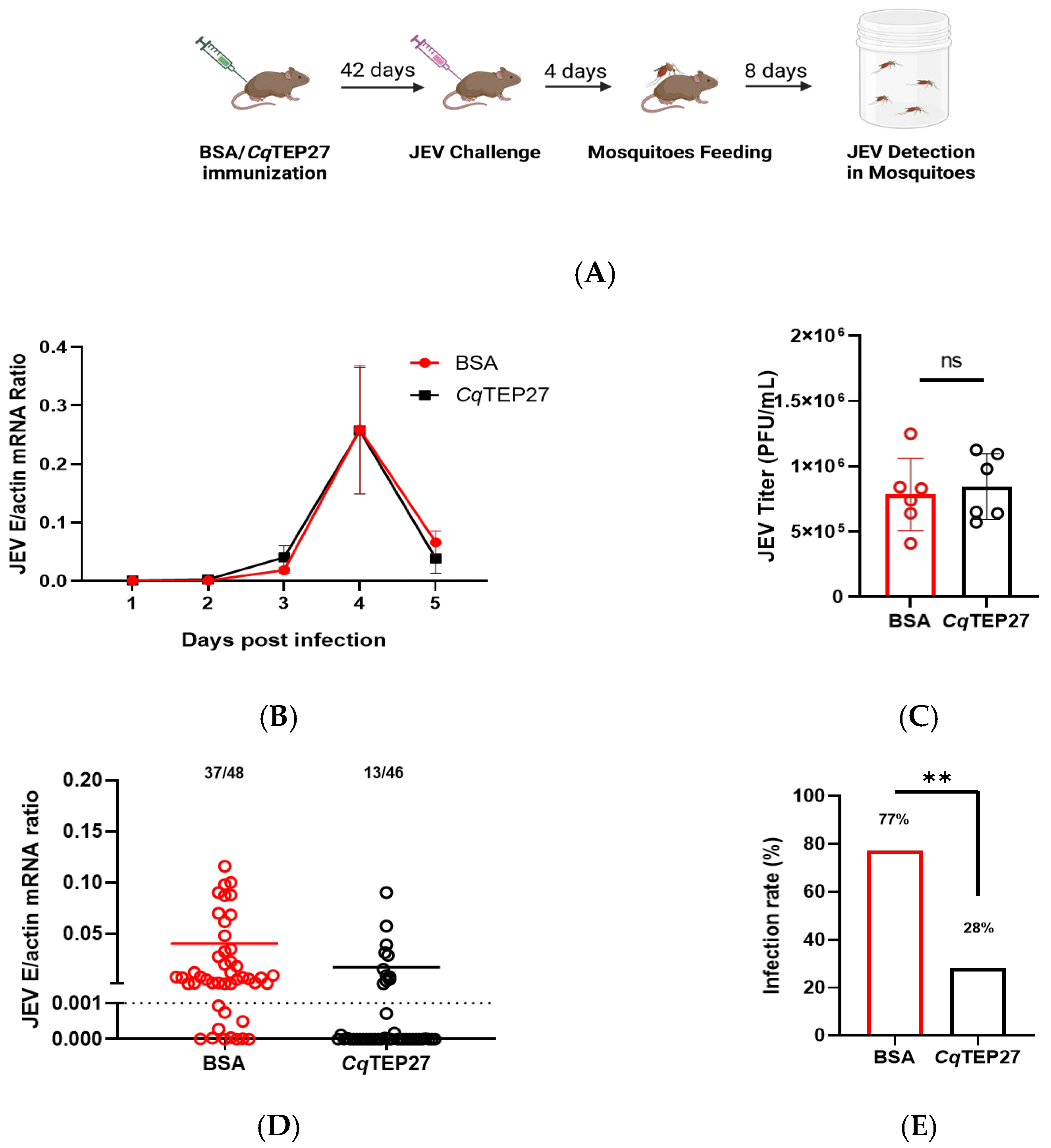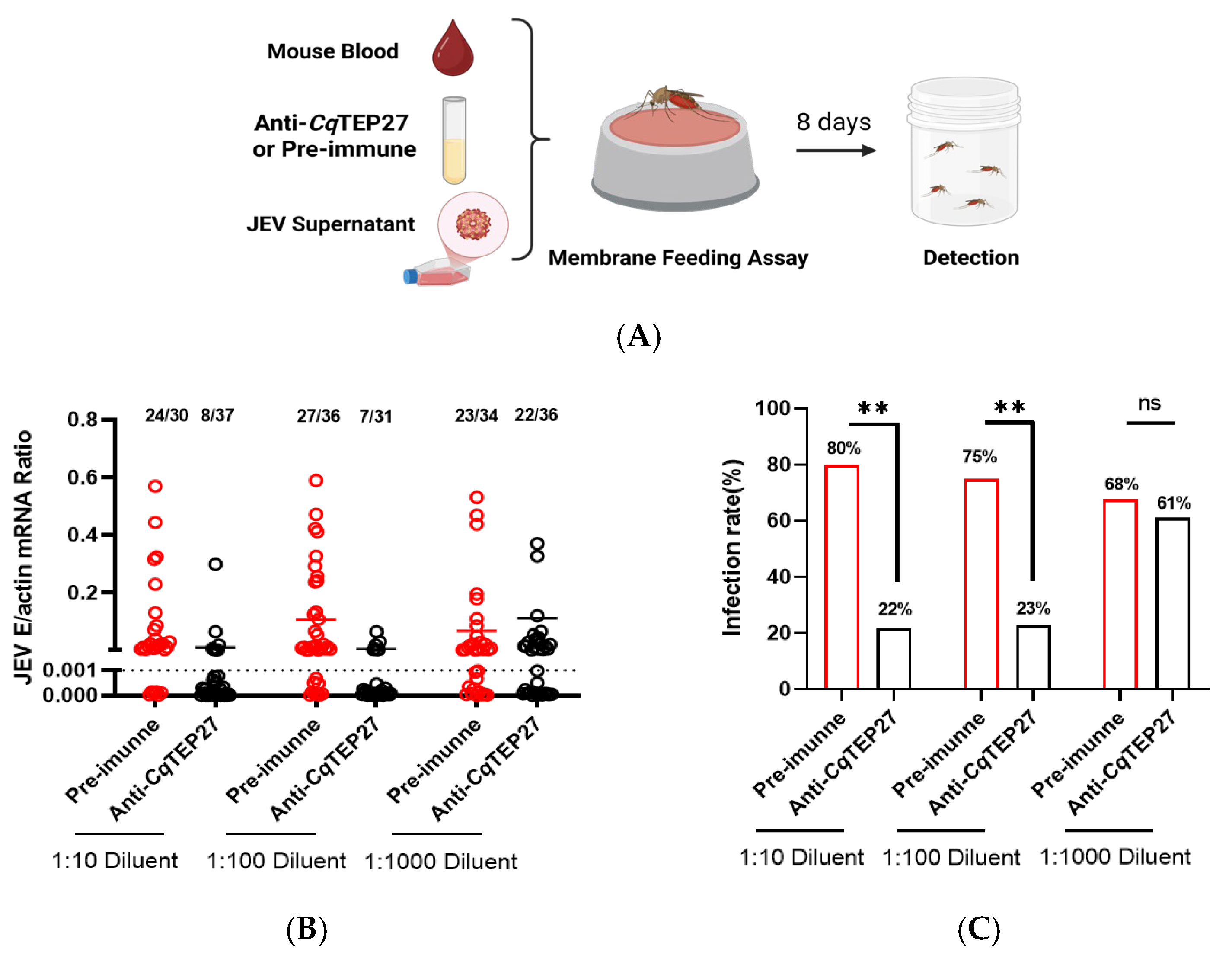 2.4. Immune-Blockade Against CqTEP27 in A129 Mice Prevents JEV Acquisition by C. quinquefasciatus