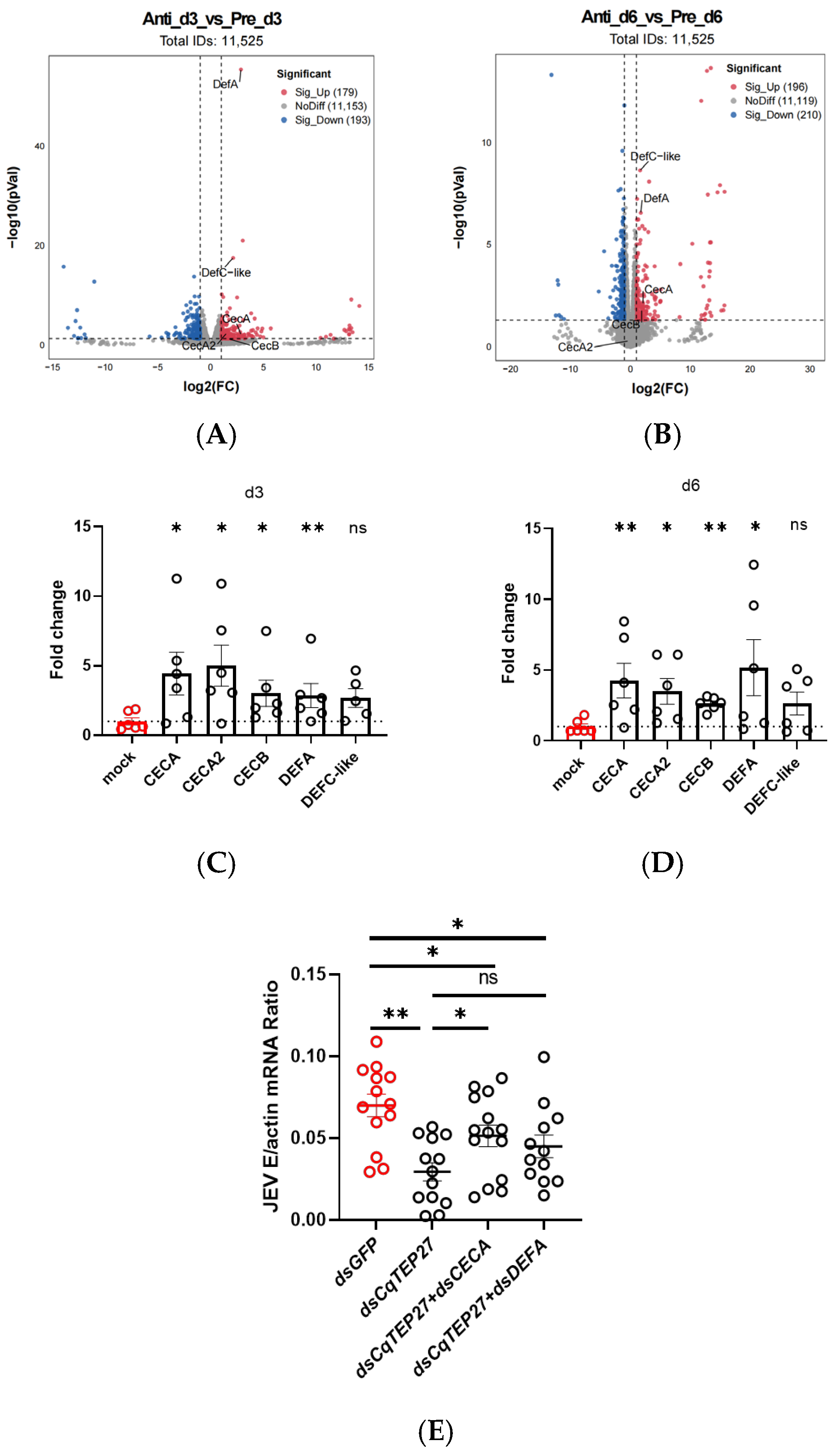 2.5. CqTEP27 Suppresses AMP Expression to Facilitate JEV Infection