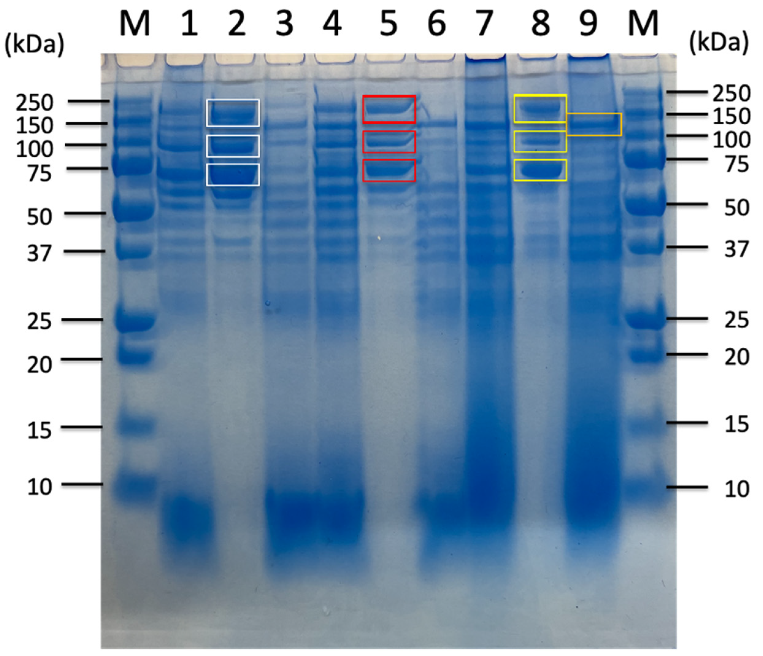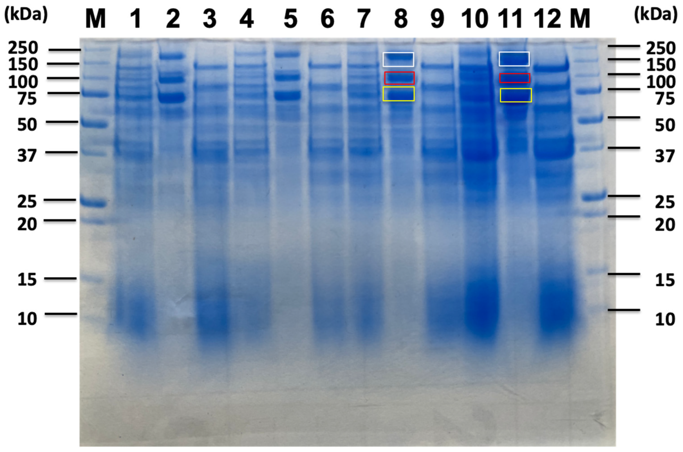 4.4. SDS-PAGE Analysis and Preparation of Crystalline Cellulose-Bound and Non-Bound Fractions