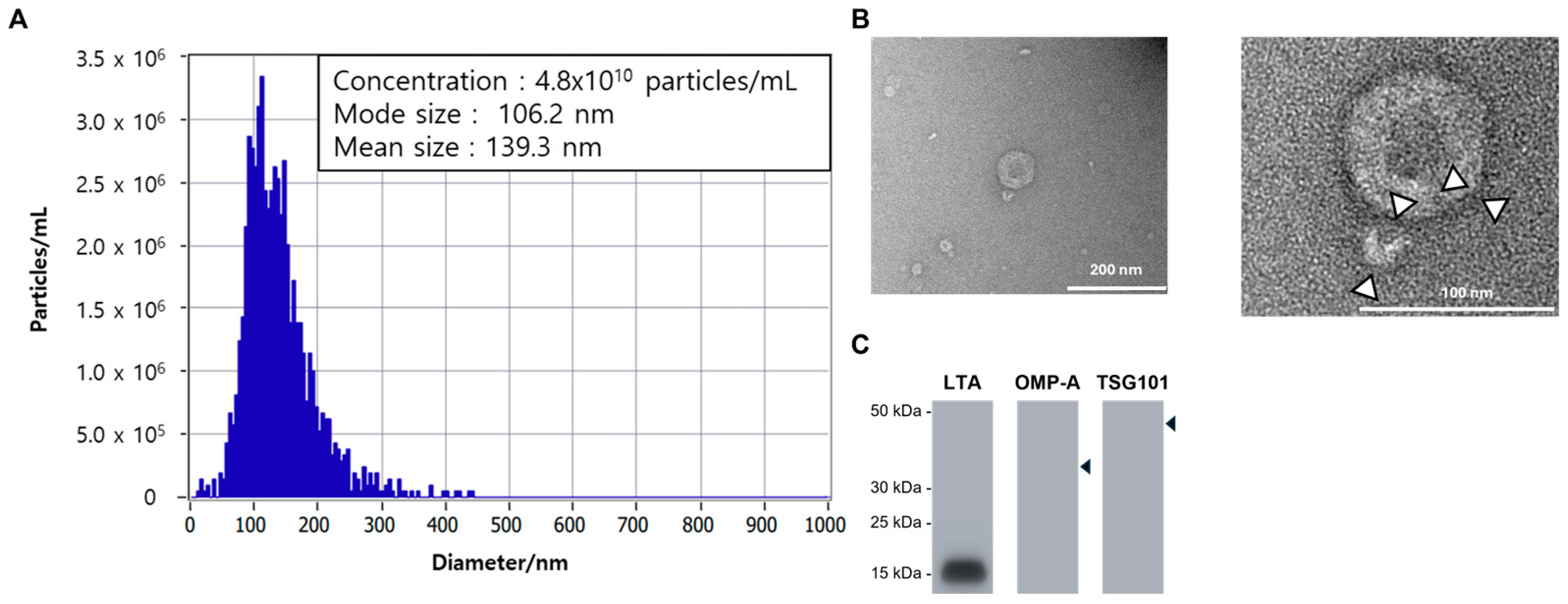 For structural characterization, Lacto EV samples were prepared for transmission electron microscopy. Samples were applied to 300-mesh copper grids followed by negative staining with a 2% uranyl acetate solution. A JEM-2100Plus transmission electron microscope (JEOL Inc., Tokyo, Japan) operating at 200 kV was used to capture the electron micrographs.