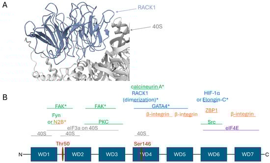 RACK1 can potentially recruit multiple partner proteins while ribosome-bound, though not all simultaneously. (A) Structure of RACK1 bound to the human 40S ribosomal subunit (PDB: 4UG0) [127]. RACK1 is positioned on the solvent-exposed surface of the 40S subunit. While a significant portion of its surface mediates ribosome contacts, the remaining area remains accessible for other interactions. (B) A linear schematic of RACK1 depicting its domain architecture and key binding sites for selected partners in the ribosome-bound state, based primarily on data from [3] and supplemented as described in the main text. The WD repeats constitute the protein’s structural domains. Regions of RACK1 that are largely occluded by the 40S subunit are indicated; other regions also contact the ribosome but possess substantial exposed surface area facing the cytosol. eIF3a, as a component of the eIF3 complex, binds the 40S subunit and helps organize the surface of initiation complexes. Proteins marked with an asterisk (*) have binding sites that potentially overlap with the ribosome or initiation factors, making their interaction with ribosome-bound RACK1 unlikely. The conjunction “or” denotes mutually exclusive binding partners. Key phosphorylation sites discussed in the text are marked with red lines: phosphorylation of Thr50 promotes RACK1 dissociation from the ribosome, while phosphorylation of Ser146 induces its dimerization. Partner proteins are color-coded: 40S subunit and eIF3a interactors (grey), kinases and phosphatases (green), translation-associated partners (purple), membrane and cytoskeleton-associated partners (orange), and partners involved in regulating gene expression at the transcriptional and translational levels (blue).
