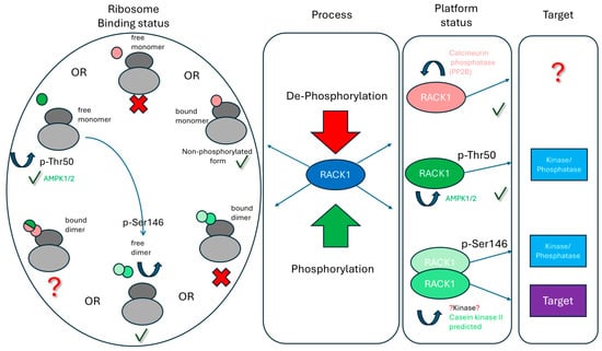 An integrated model of RACK1 function and regulation. Phosphorylated forms of RACK1 are indicated in green; unmodified or dephosphorylated forms are shown in red. Crosses (X) denote unlikely or disfavored states, while question marks (?) indicate transitions or states requiring further validation. RACK1 integrates multiple signaling inputs by concurrently associating with phosphorylating/dephosphorylating enzymes and their target substrates. The dynamic balance between RACK1 functional states is regulated by phosphorylation/dephosphorylation and cellular context, thereby determining phenotypic outcomes. Key transitions include: (1) Monomeric unphosphorylated RACK1 associating with the ribosome; (2) Thr50-phosphorylated RACK1 dissociating from the ribosome; (3) Free RACK1 undergoing dimerization; (4) Ser146-phosphorylated RACK1 being dephosphorylated by calcineurin, restoring monomeric state and ribosomal association to resume translational functions. See main text for detailed explanations.