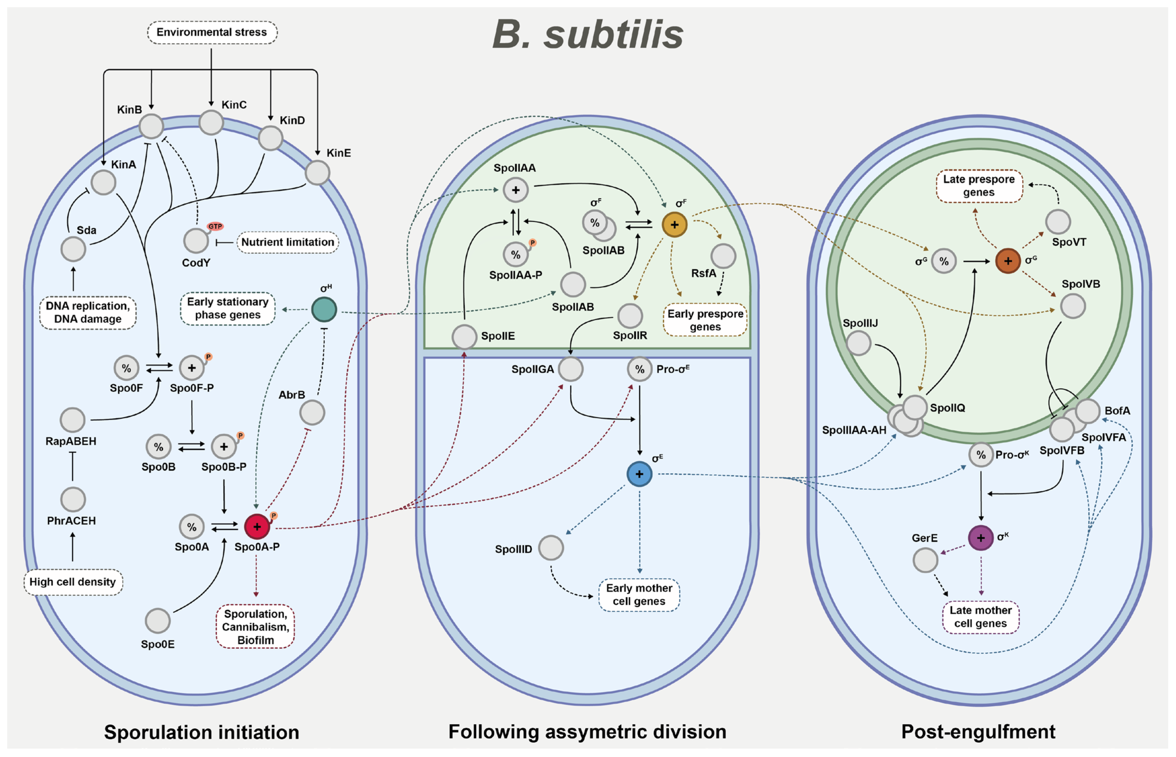 B. subtilis, the key regulatory steps can roughly be divided into three phases based on the precise sequential activation of a cascade of sigma factors [