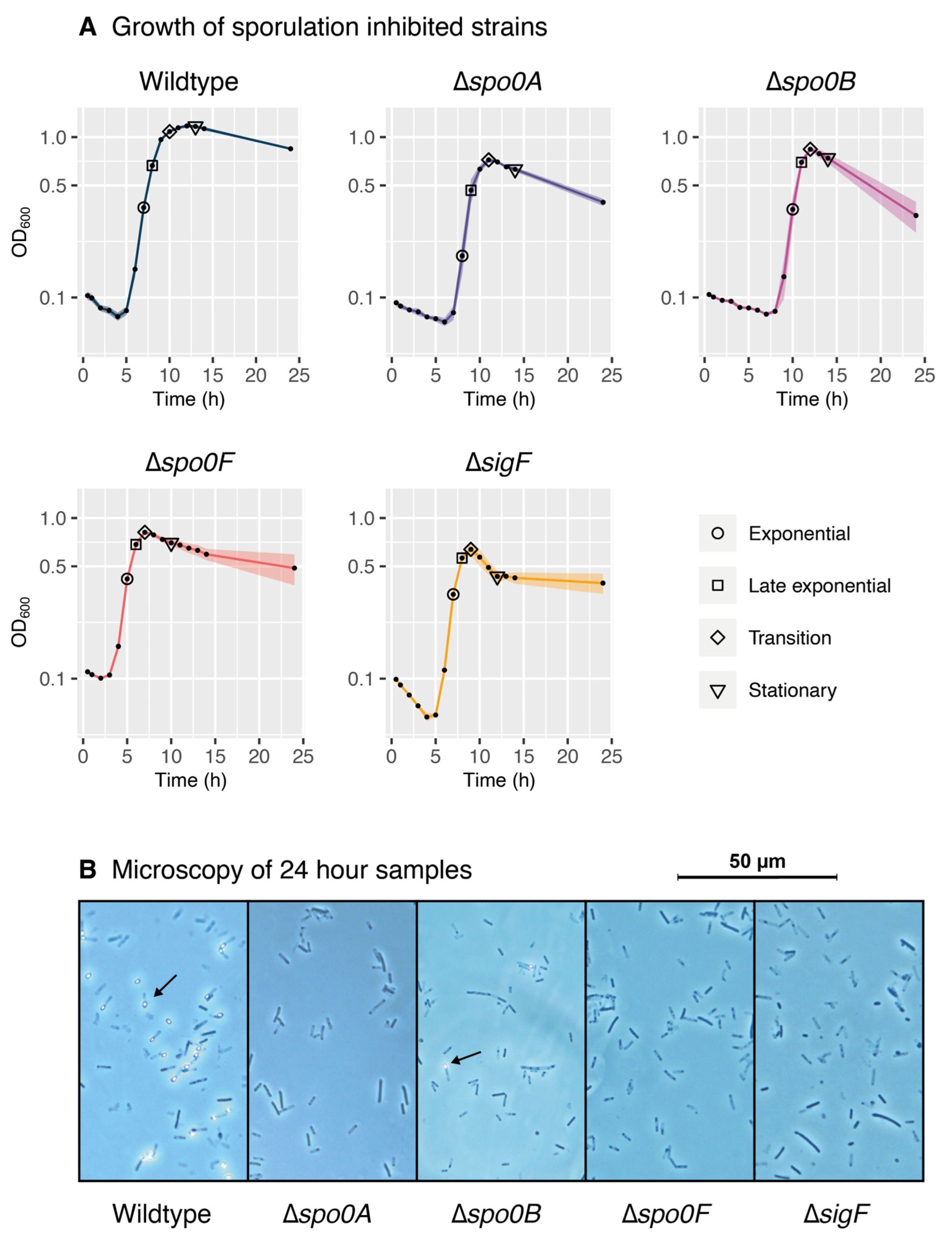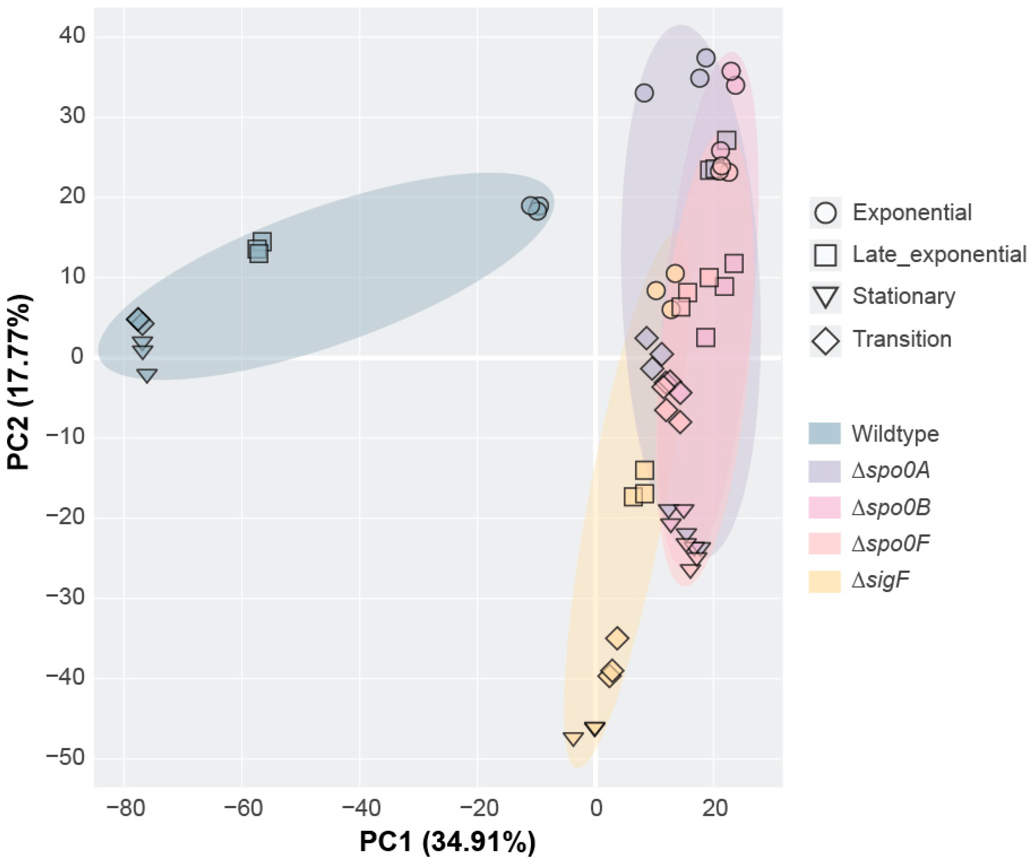 B. subtilis, this study aims to investigate the impact of deleting pre-commitment regulators Spo0A, Spo0B, Spo0F, and σ