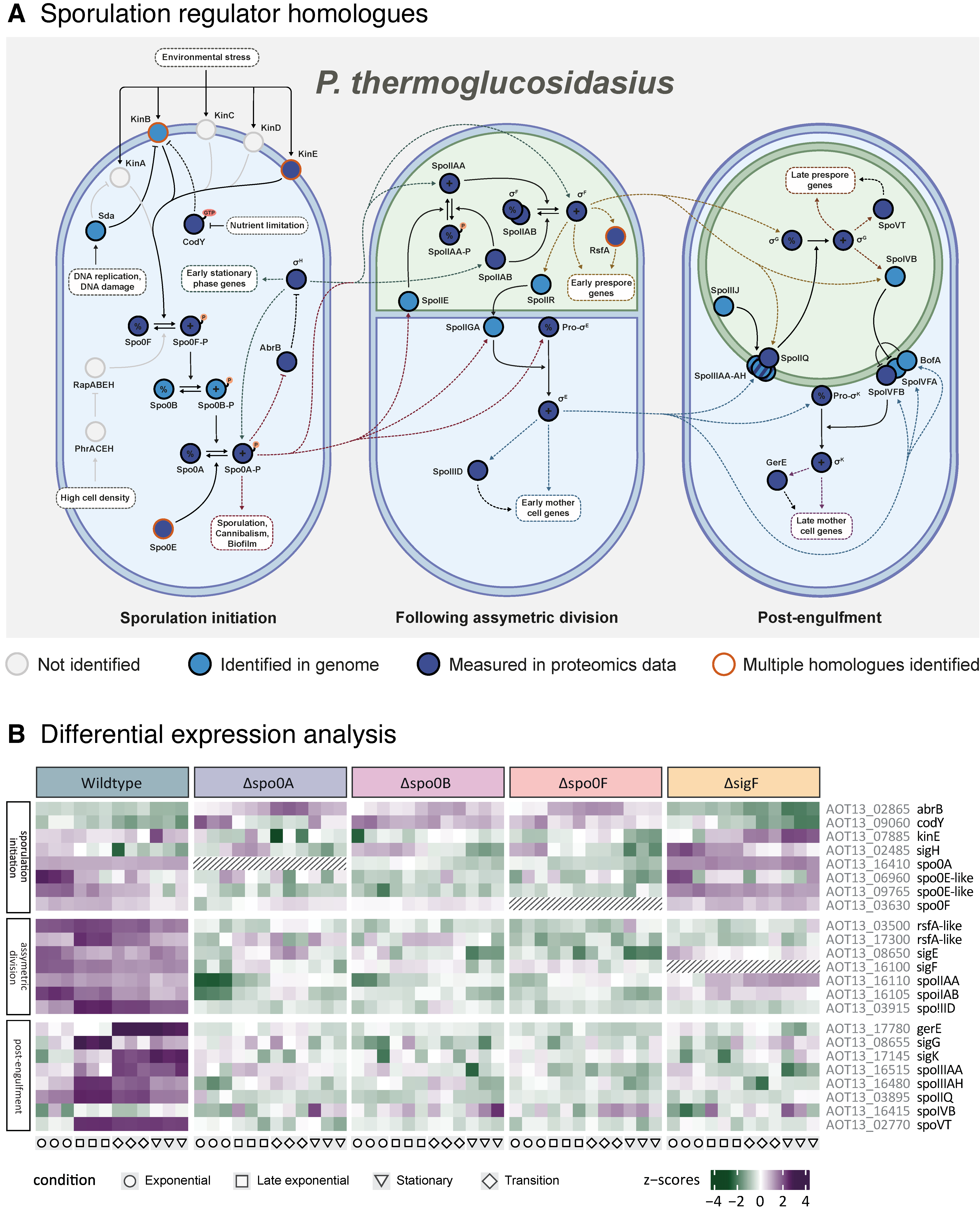 In this study, we operated under the assumption that the P. thermoglucosidasius sporulation pathway is comparable to that of B. subtilis. The present investigation of the P. thermoglucosidasius sporulation sigma factor cascade provides support for this theory. In our analysis, we found that P. thermoglucosidasius carries many homologues of B. subtilis sporulation regulators, which exhibit expression patterns largely consistent with those expected from the B. subtilis network. Interestingly, homologues of many B. subtilis sporulation initiation regulators remain unidentified in the P. thermoglucosidasius genome, including several of the kinases that activate the phosphorelay as well as the negative regulators RapABEH. Consequently, little is known about the parameters that govern the entry into the P. thermoglucosidasius sporulation pathway, raising the possibility that they may differ from those of B. subtilis. As this study did not manage to cover the early sporulation initiation phase in P. thermoglucosidasius, more data will need to be collected to unveil the regulators involved in this complex process. In addition, this study confirmed that the deletion of the predicted early-stage regulators Spo0F, Spo0B, Spo0A, and σF inhibits the sporulation pathway of P. thermoglucosidasius, again consistent with what would be expected from B. subtilis. Although the gene deletions did not significantly affect the growth rate of the strains, the transition into the stationary phase was more abrupt and occurred at a lower OD than in the wildtype, likely a sign of their disrupted regulation. Notably, microscopy analysis revealed that the deletion of Spo0B did not completely disable sporulation, but still appeared to largely inhibit the process, a pattern for which no equivalent case has been described in B. subtilis so far. As only a low amount of sporulation was observed in the Spo0B cultures, the proteomic profiles of the sporulating cells were likely drowned out by the non-sporulating ones during data extraction for this study. More research into the mechanisms that may allow P. thermoglucosidasius to bypass the Spo0B regulatory step is therefore necessary.