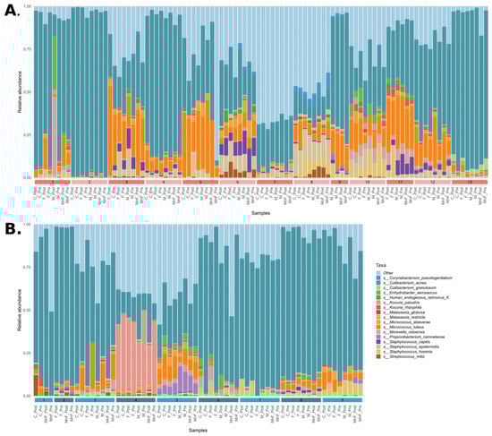Bar plots of the community composition of species that were (1) present in more than 25% of samples and (2) with a relative abundance > 0.1% in the samples. (A) Patients with atopic dermatitis and panel (B) healthy controls. Samples are grouped by individual, indicated by coloured numbered bars along the bottom of each bar plot.
