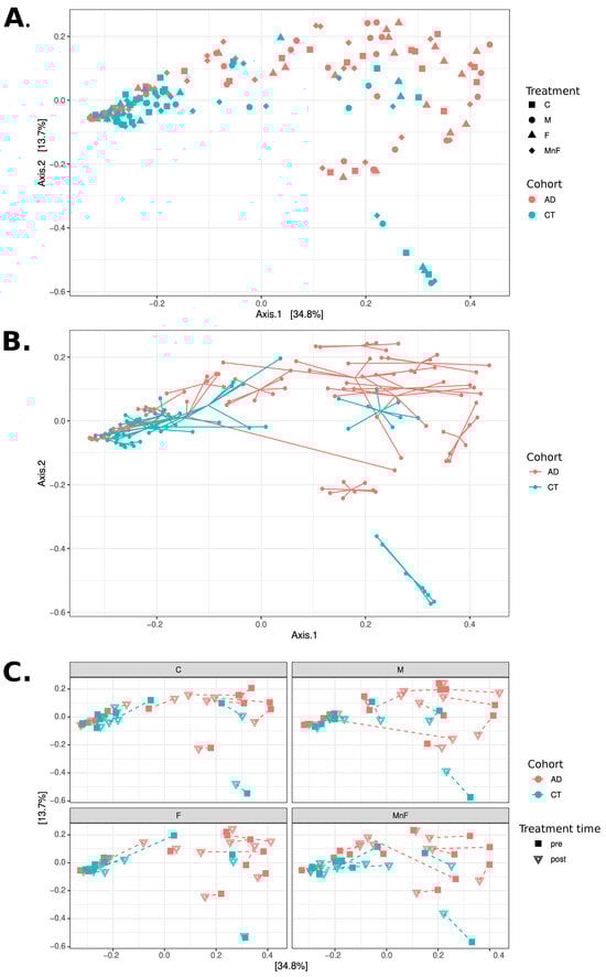 PCoA analyses at the species level using Bray–Curtis distances. All three panels display PCoA plots of the same samples in the same coordinate system. (A) Samples coloured by cohort, with shape indicating treatment (C, M, F, MnF). Note how the CT cohort appears mostly concentrated to the left, while the AD cohort is mostly located in the upper right of the figure. (B) Samples coloured by cohort, with samples belonging to the same individual connected with lines. Note how individuals appear to have mostly distinct personal microbiome compositions. (C) Four subgraphs showing each treatment group in separate subplots using the same coordinate system, coloured by cohort. The shape of points indicates treatment time (pre vs. post), with each individual’s pre- and post-samples connected with a dashed line. Note that only a few individuals exhibit substantial changes in composition between pre- and post-treatment.
