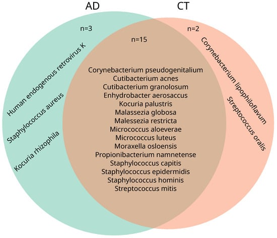 Venn diagram of core species from the two cohorts. Core species: at least 0.1% relative abundance found in at least 30% of samples from the sample group. Both cohorts show an overlap in most identified core species (15 overlapping species), with the exception of three species unique to the AD cohort: Kocuria rhizophilia, human endogenous retrovirus K, and Staphylococcus aureus, and two species unique to the CT cohort: Corynebacterium lipophiloflavum and Streptococcus oralis.