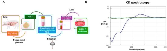 Lyophilized lung porcine extracts were received from Neorland s.r.l. (Cremona, Italy). Young Italian-origin healthy male and female pigs (consisting of 150 kg in weight) were slaughtered, and soon after slaughtering, the organs were isolated carefully. The slaughtering process was performed in accordance with the EU/regulations 852/04 and 853/04, and animal welfare requirements were also met as described in the EU rules 2073/05 and 1099/09. After isolation, the organs were packed and transported to the freezing phase (−20 °C). The organs were subjected to sublimation, followed by a drying process in which all the water was removed. The various steps of the freeze-drying procedure were followed according to the guidelines mentioned by producers (involving various temperature-lowering steps). The organs were then ground, and after removal of impurities, were packed in a triple-layer aluminum bag [4,25]. The same method was used for the preparation of porcine lung extract. Two different FDLT batches (A and B) (see Supplementary Materials) were tested in the analyses of normal primary cell lines. Batch B was employed for the analyses of the NSCLC cell lines.