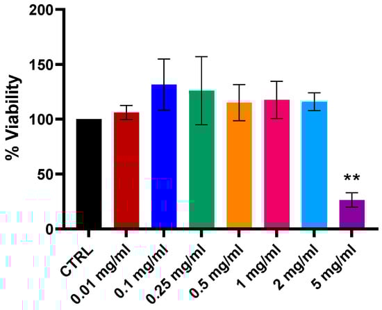 Cell viability of porcine fibroblasts treated with different concentrations of FDLT, showing no cytotoxicity at lower doses as measured by MTT assay. Statistical significance is indicated as follows: ** p < 0.01.