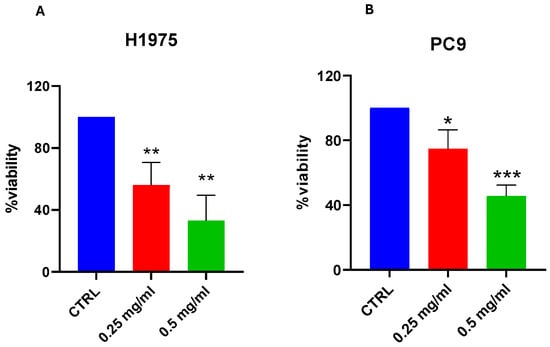 Effect of FDLT on cell viability. (A) MTS assay after 72 h incubation with FDLT 0.25 and 0.5 mg/mL showed dose-dependent reduction in H1975 cell viability. (B) MTS assay after 72 h treatment with FDLT 0.25 and 0.5 mg/mL resulted in a dose-dependent decrease in PC9 cell viability. Statistical significance is indicated as follows: * p < 0.05, ** p < 0.01, *** p < 0.001.