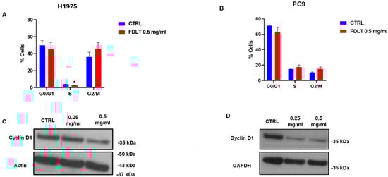 Cell cycle distribution and western blot analysis of cyclin D1. (A,B) The graphical representation of cell-cycle profiles for H1975 (A) and PC9 (B) cells demonstrated that FDLT treatment resulted in accumulation of cells in the G2/M phase and a corresponding reduction in progression to the G1 and S phases. (C,D) Western blot analysis of cyclin D1 levels in untreated and treated H1975 (C) and PC9 (D) cells showed that FDLT induced a marked decrease in protein expression. Data are presented as mean ± SD. Statistical significance is indicated as follows: * p < 0.05. GAPDH and Actin were used as loading controls.