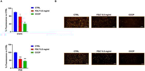 FDLT-dependent modulation of mitochondrial membrane potential. (A) Quantitative analysis of MMP modulation in both H1975 and PC9 cells treated with 0.5 mg/mL of FDLT after 72 h of incubation. Statistical significance is indicated as follows: * p < 0.05, ** p < 0.01; (B) Representative fluorescent images of MMP in H1975 and PC9 cells after 72 h of treatment. (Scale bar = 100 μm).