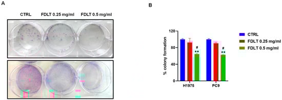 (A) Colony formation in untreated and treated NSCLC cells. (B) FDLT treatment led to a significant reduction in cell colony formation in both cell lines. Statistical significance is indicated as follows: # p < 0.05, versus FDLT 0.25 mg/ml; ** p < 0.01. versus CTRL.