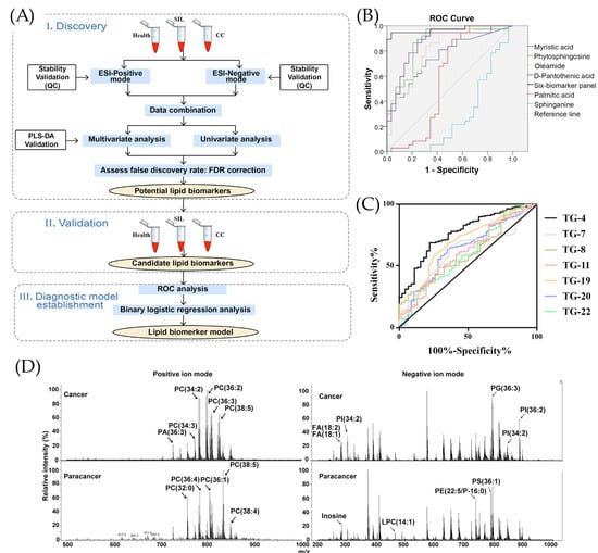 There is a proposed method for the detection of tumor biomarkers for cervical cancer (CC) using the lipidomic analysis performed using UHPLC/Q-TOF-MS by Cheng et al. [42]. As illustrated in Figure 1A, the process contains discovery, validation, and establishment of the diagnostic model, where lipid biomarkers are analyzed by UHPLC-Q-TOF-MS after their successful extraction from serum [42]. The diagnostic performance of these biomarkers were assessed by an analysis of ROC curves, corresponding to which phosphatidylethanolamine (PE) reached an AUC value of 0.9 [42].