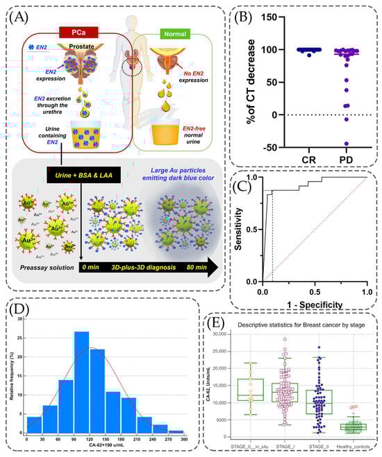 Clinical performance of the implementation of immunoassays into detection techniques. (A) Detection mechanism of prostate cancer-specific urinary EN2 using 3D-plus-3D immunoassay, adopted with modification from Kim et al. [91] under the terms of the Creative Commons Attribution License (CC BY). (B) Scatter plot presenting the calcitonin decreasing rate, comparing complete response vs. persistent disease. (C) ROC curve analysis considering the decreasing rate of calcitonin values, showing the levels of sensitivity and specificity, adopted with permission from Sparano et al. [89] under the terms of the Creative Commons Attribution License (CC BY). (D) Comparison of CA-62 levels in serum using samples of healthy controls and from all breast cancer groups. (E) Minimum and maximum values presented using error bars for different stages of breast cancer, adopted with modification from Sekacheva et al. [90] under the terms of the Creative Commons Attribution License (CC BY).
