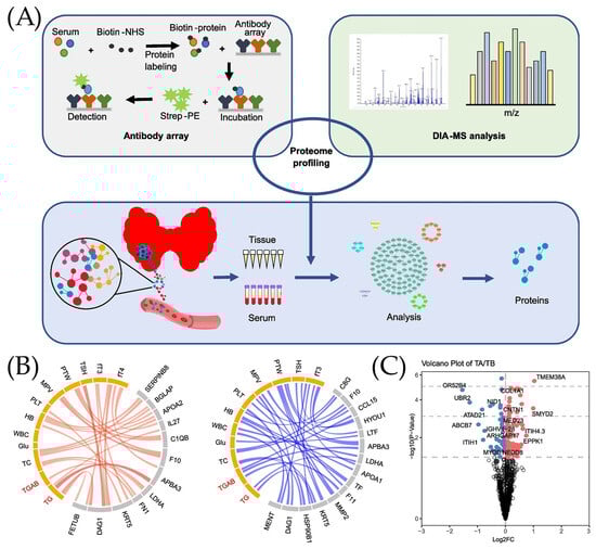Clinical performance of ELISA technique. (A) Working principal of in-depth papillary thyroid cancer (PTC) serum and tissue proteomics. (B) Circus diagram used for presentation of positive (red) and negative (blue) correlations between serum proteome and clinical data. (C) Volcano plot analysis used for the identification of proteins associated with papillary thyroid cancer (PTC) in serum before and after surgery, adopted from Ye et al. [74] under the terms of the Creative Commons Attribution License (CC BY).
