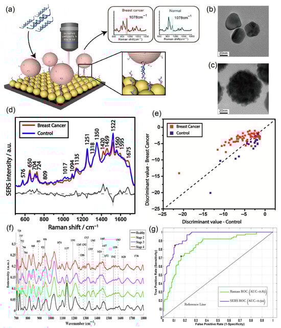- Nargis, H.; Nawaz, H.; Bhatti, H.; Jilani, K.; Saleem, M. Comparison of surface enhanced Raman spectroscopy and Raman spectroscopy for the detection of breast cancer based on serum samples. Spectrochim. Acta Part A Mol. Biomol. Spectrosc. 2021, 246, 119034. [Google Scholar] [CrossRef]