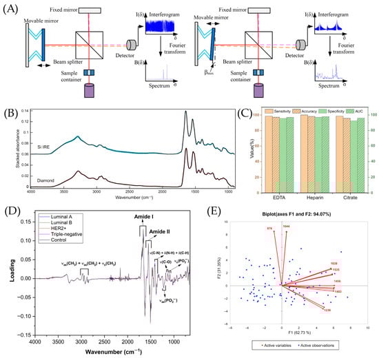 - Du, Y.; Xie, F.; Yin, L.; Yang, Y.; Yang, H.; Wu, G.; Wang, S. Breast cancer early detection by using Fourier-transform infrared spectroscopy combined with different classification algorithms. Spectrochim. Acta Part A Mol. Biomol. Spectrosc. 2022, 283, 121715. [Google Scholar] [CrossRef]