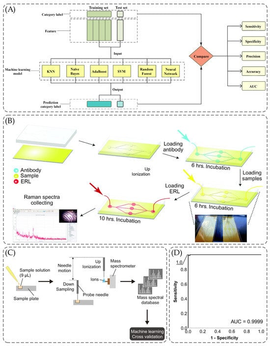 - Banaei, N.; Moshfegh, J.; Mohseni-Kabir, A.; Houghton, J.M.; Sun, Y.; Kim, B. Machine learning algorithms enhance the specificity of cancer biomarker detection using SERS-based immunoassays in microfluidic chips. RSC Adv. 2019, 9, 1859–1868. [Google Scholar] [CrossRef]