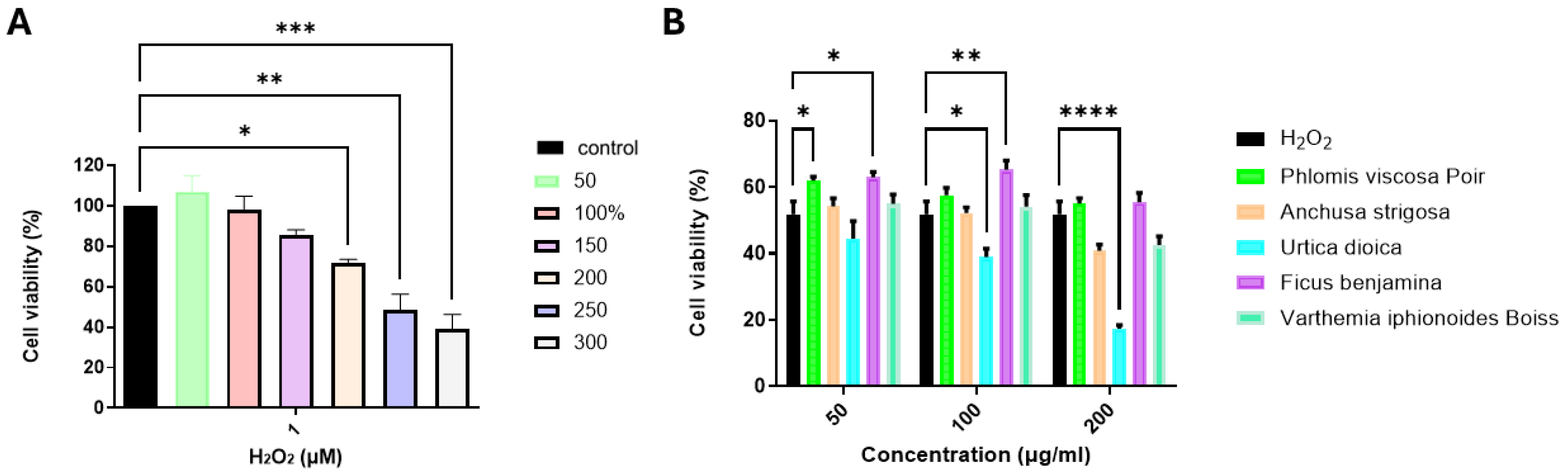 2.1. Evaluation of the Neuroprotective Effects of Plant Extracts on H2O2-Treated SH-SY5Y Cells