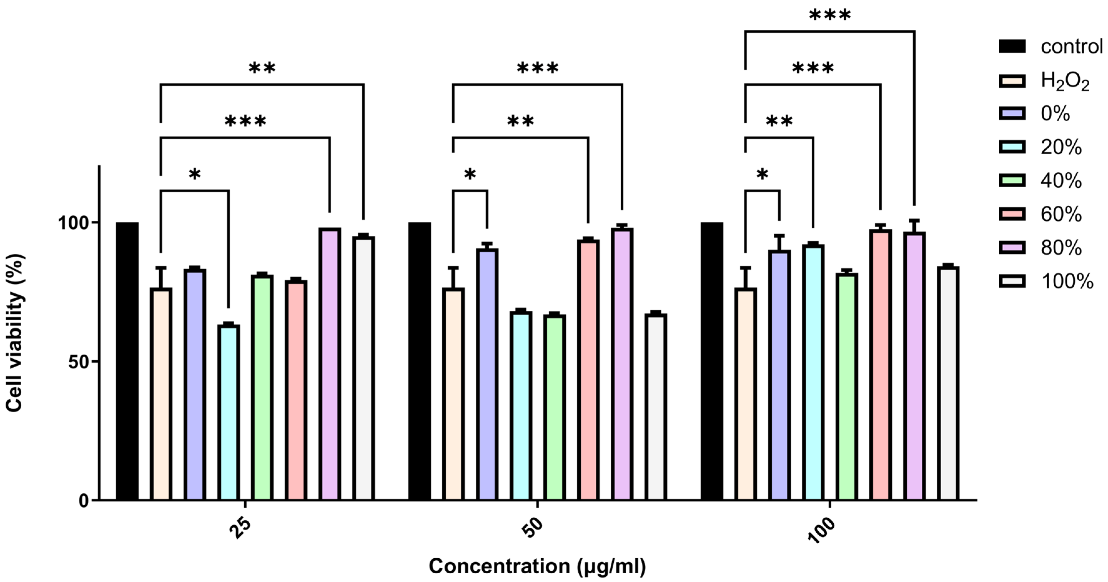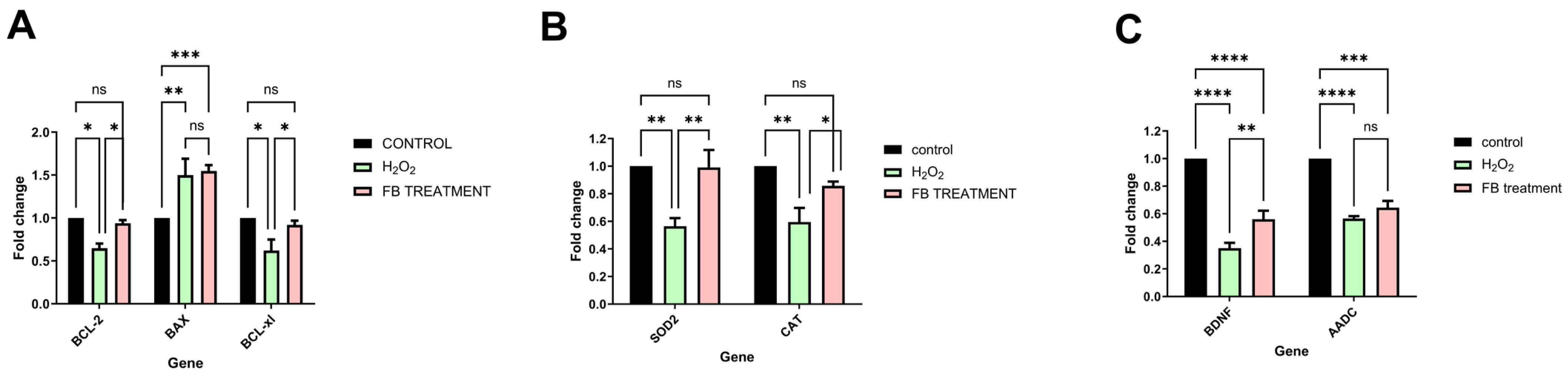 2.2. Evaluation of the Neuroprotective Effects of F. benjamina Fractions on H2O2-Treated SH-SY5Y Cells