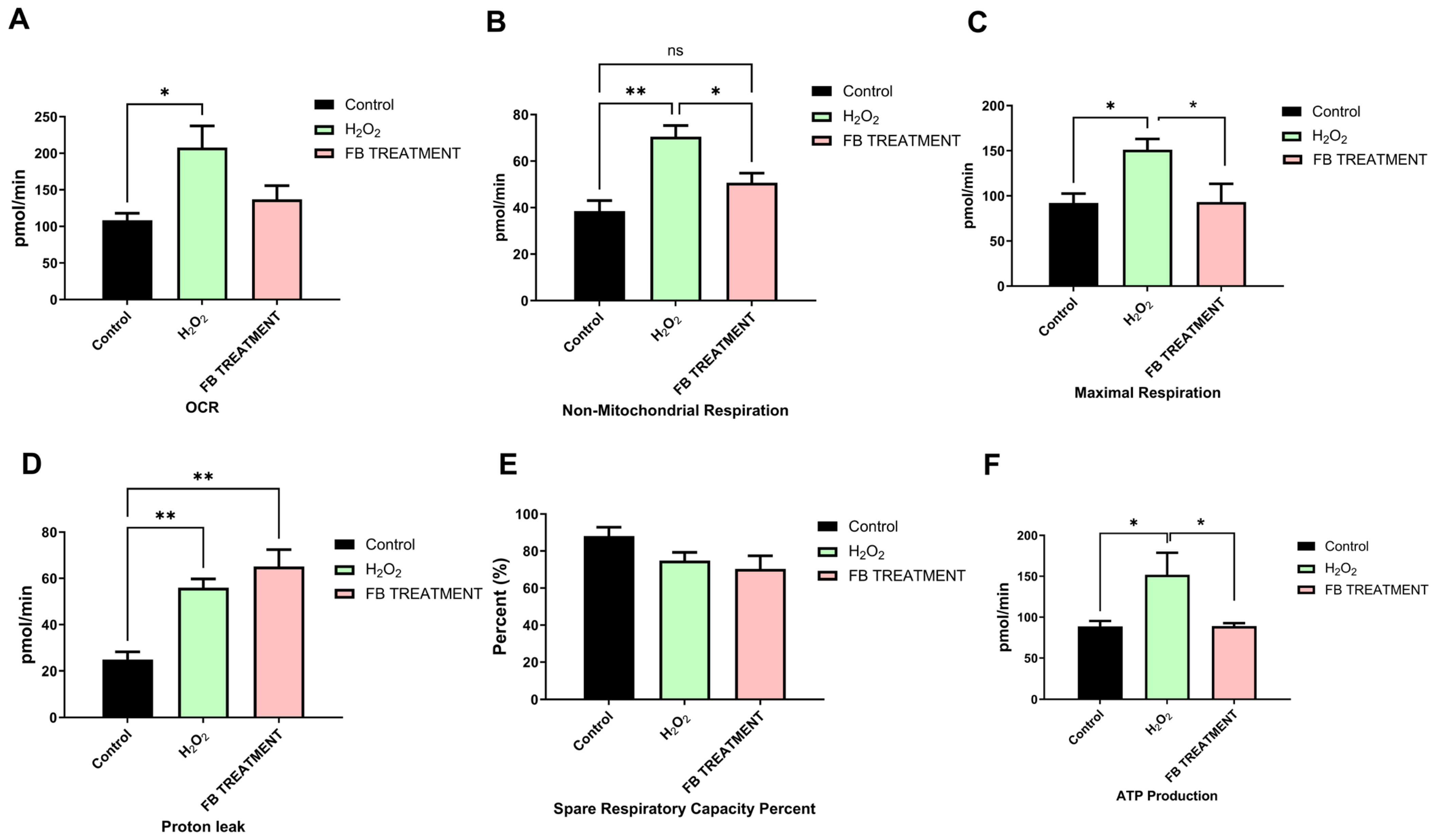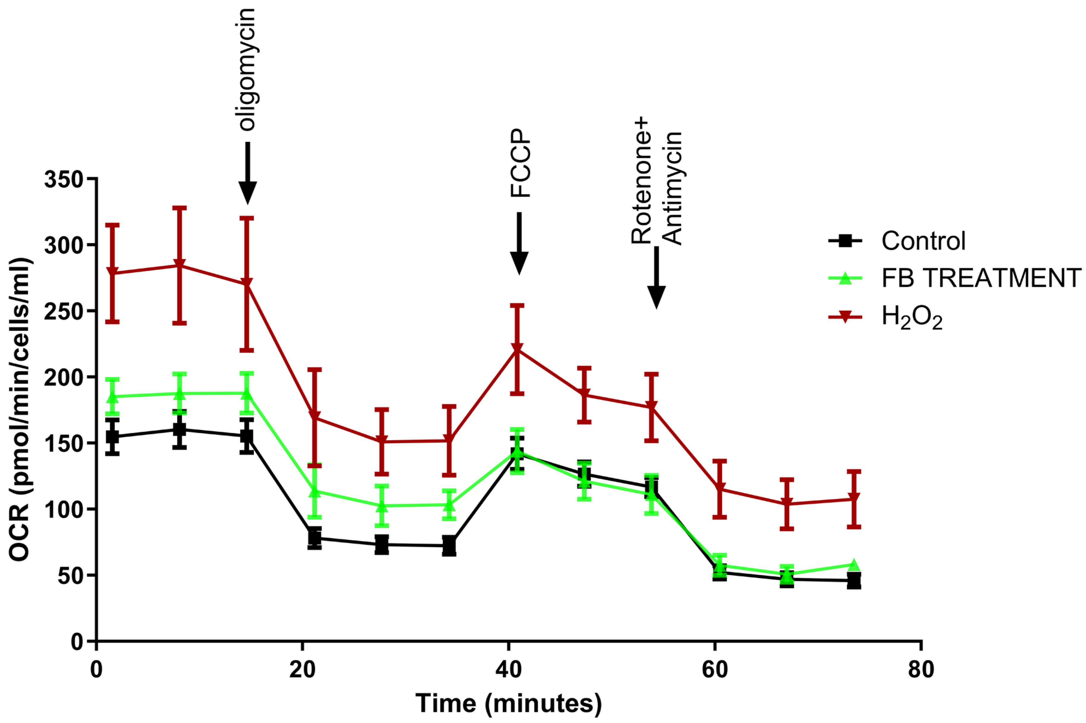 2.3. Favorable Effects of F. benjamina 80% Fraction on Mitochondrial Respiration in H2O2-Treated SH-SY5Y Cells