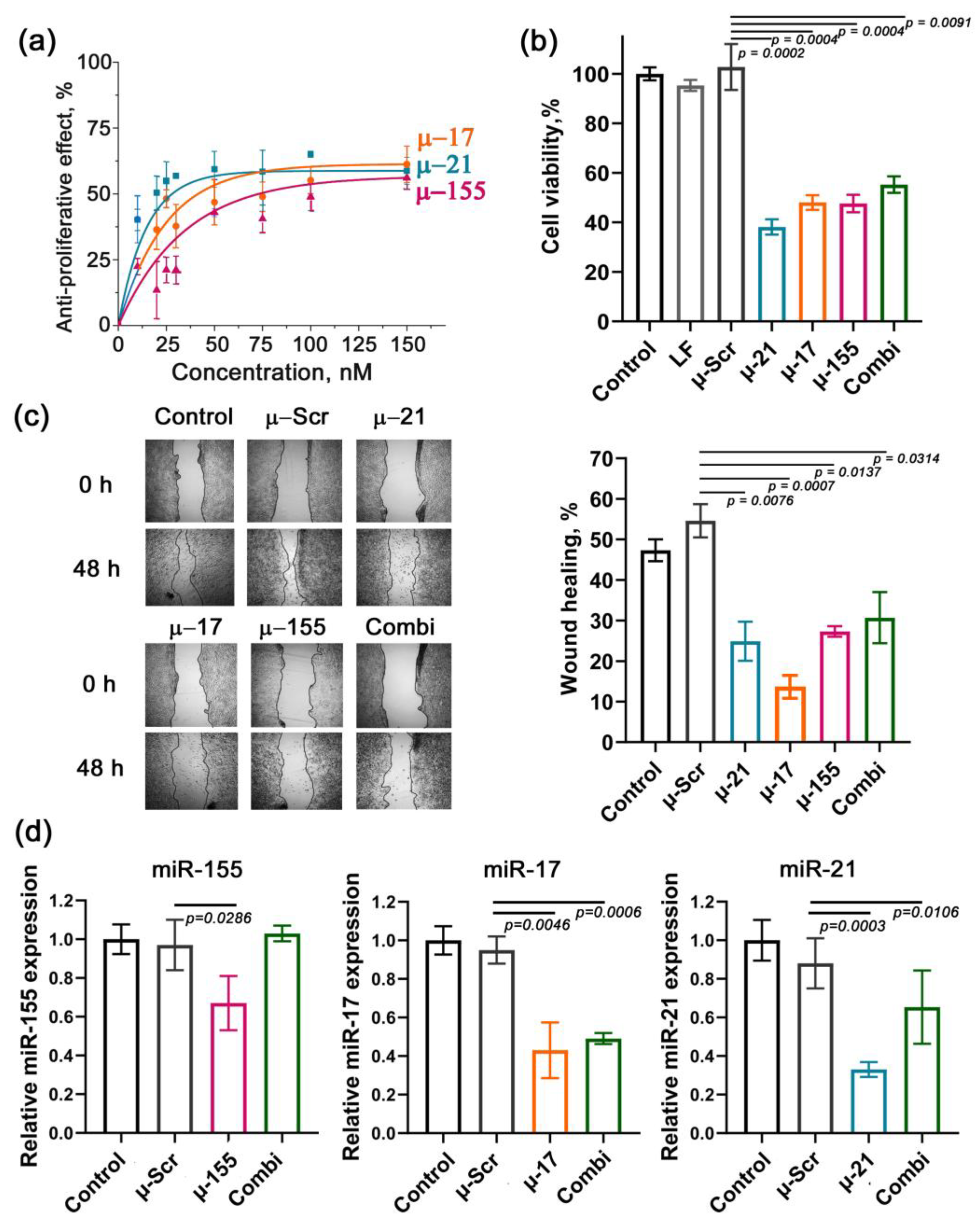 3.1. Therapeutically Beneficial Effects of µ-ASO Targeted to miR-21, miR-17, and miR-155 in Caco-2 Cells