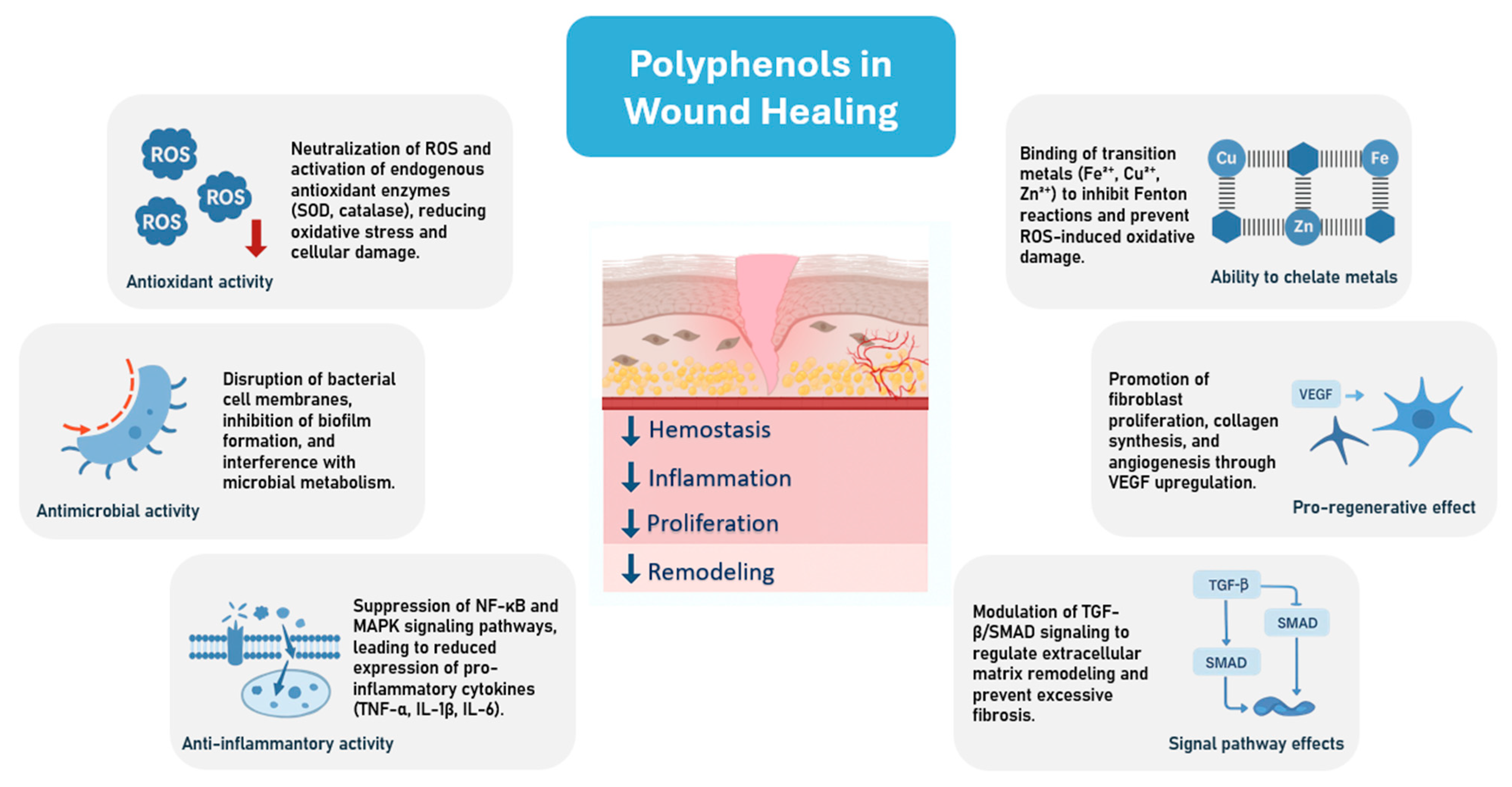 - Utpal, B.K.; Sutradhar, B.; Zehravi, M.; Sweilam, S.H.; Panigrahy, U.P.; Urs, D.; Fatima, A.F.; Nallasivan, P.K.; Chhabra, G.S.; Sayeed, M.; et al. Polyphenols in wound healing: Unlocking prospects with clinical applications. Naunyn–Schmiedeberg’s Arch. Pharmacol. 2025, 398, 2459–2485. [Google Scholar] [CrossRef]