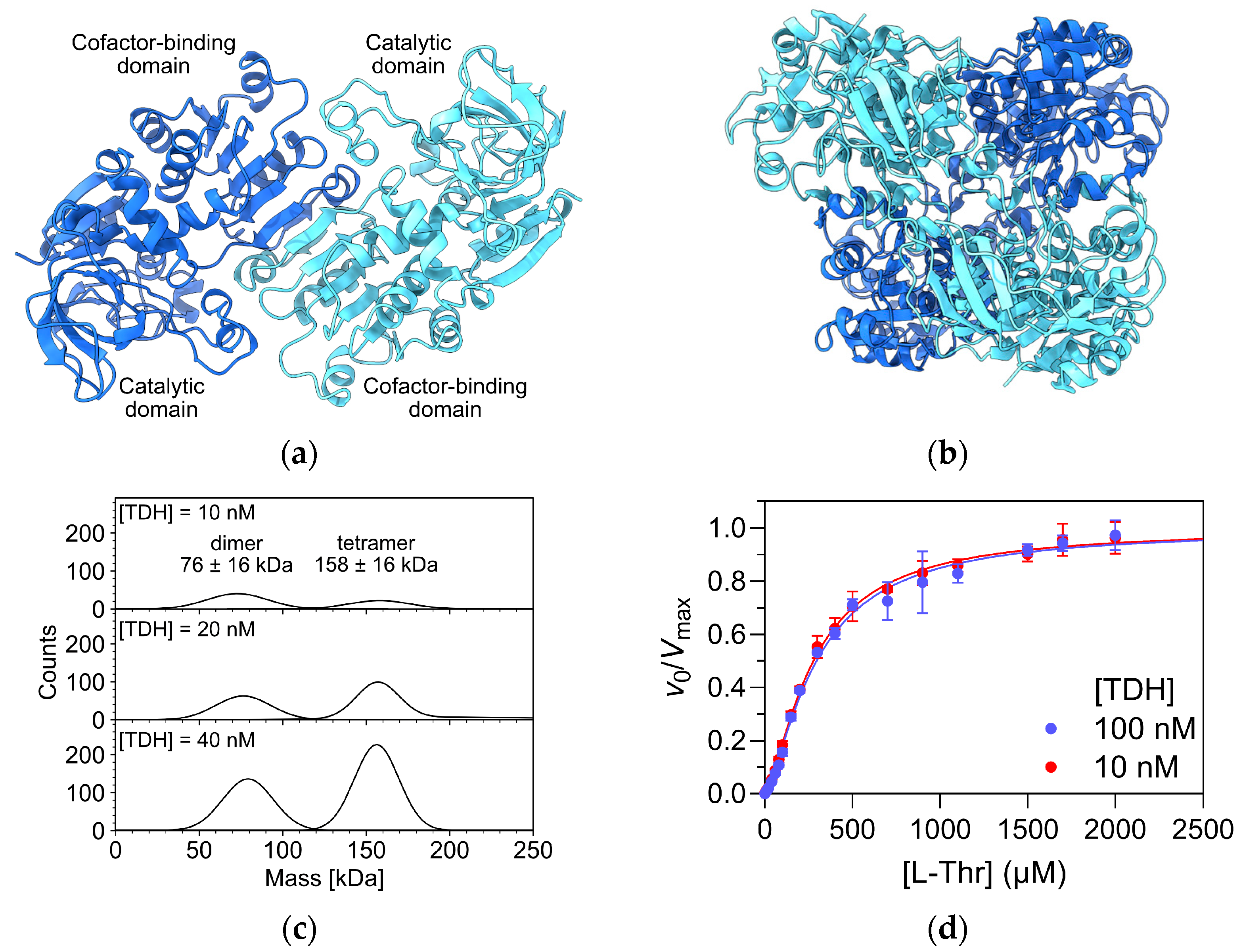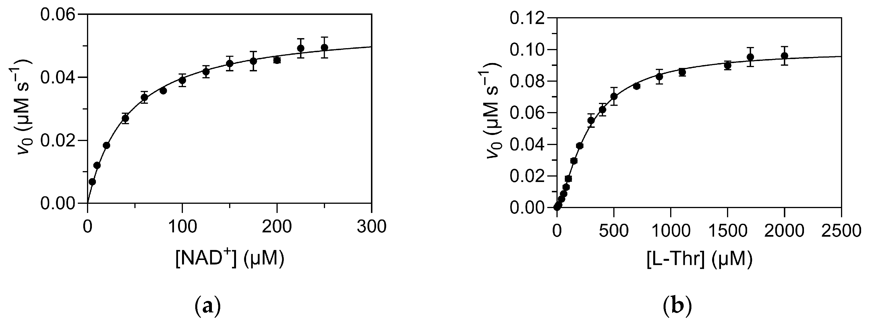 - Craig, P.A.; Dekker, E.E. L-Threonine Dehydrogenase from Escherichia coli K-12: Thiol-Dependent Activation by Mn2+. Biochemistry 1986, 25, 1870–1876. [Google Scholar] [CrossRef] [PubMed]