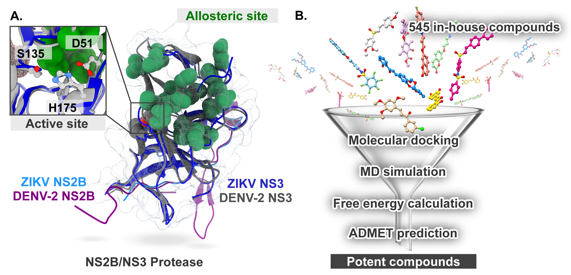 - Gangopadhyay, A.; Saha, A. Exploring allosteric hits of the NS2B-NS3 protease of DENV2 by structure-guided screening. Comput. Biol. Chem. 2023, 104, 107876. [Google Scholar] [CrossRef]