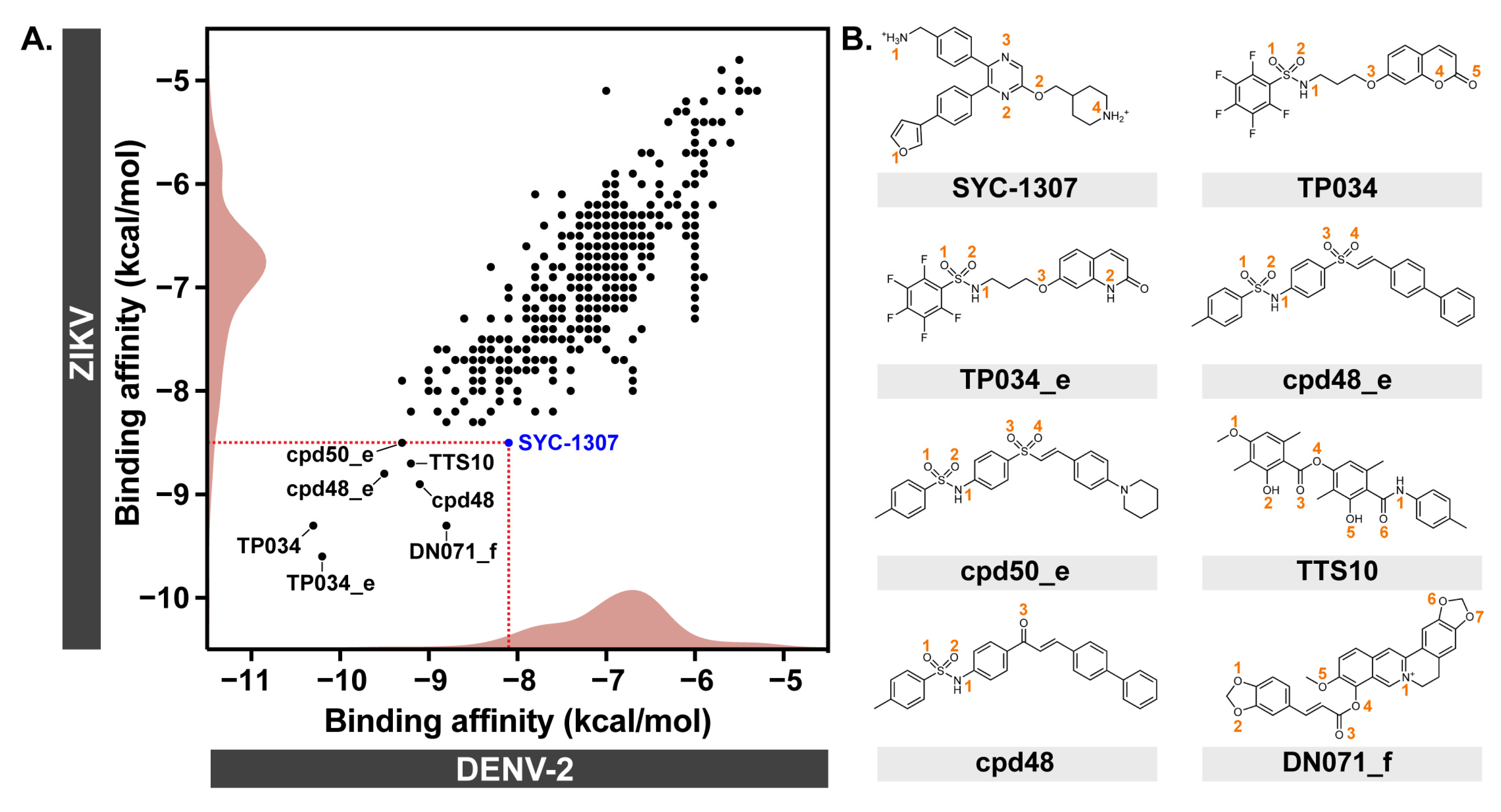 | TP034 | Sulfonamide, Coumarin | −10.3 | −9.3 |