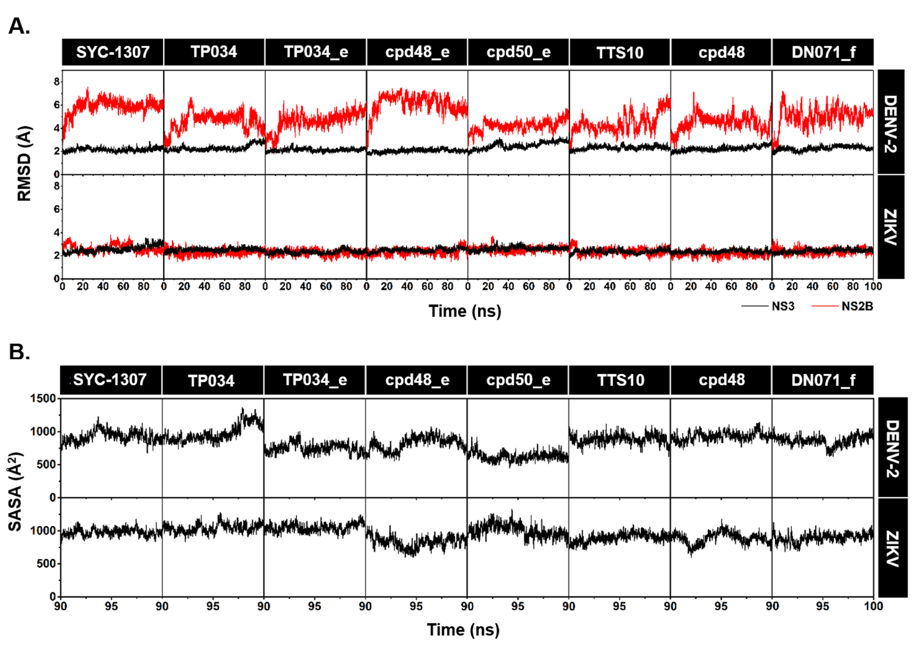 - Nutho, B.; Rungrotmongkol, T. Binding recognition of substrates in NS2B/NS3 serine protease of Zika virus revealed by molecular dynamics simulations. J. Mol. Graph. Model. 2019, 92, 227–235. [Google Scholar] [CrossRef]