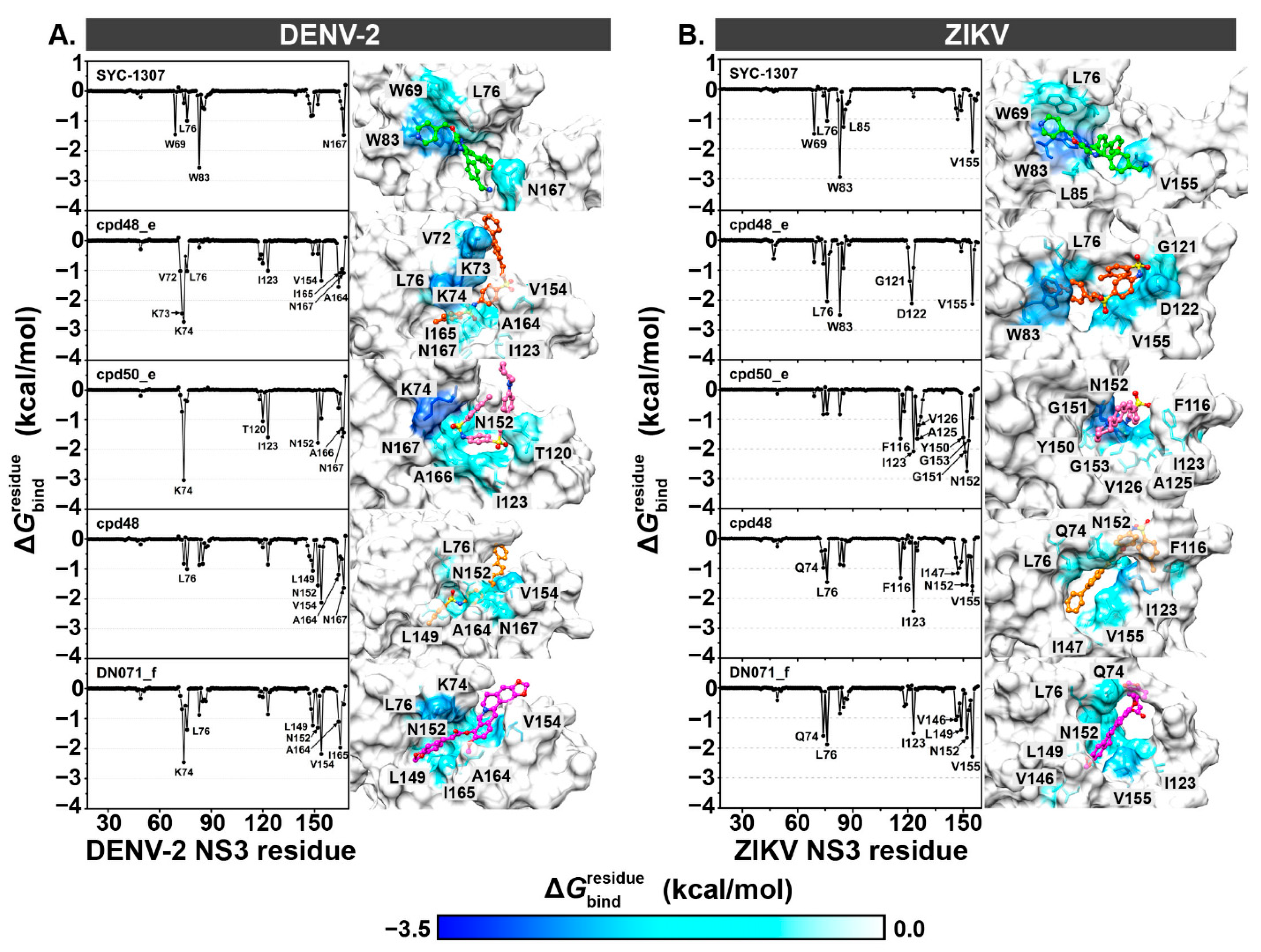 - Aguilera-Pesantes, D.; Robayo, L.; Méndez, P.; Mollocana, D.; Marrero-Ponce, Y.; Torres, F.; Méndez, M. Discovering key residues of dengue virus NS2b-NS3-protease: New binding sites for antiviral inhibitors design. Biochem. Biophys. Res. Commun. 2017, 492, 631–642. [Google Scholar] [CrossRef] [PubMed]