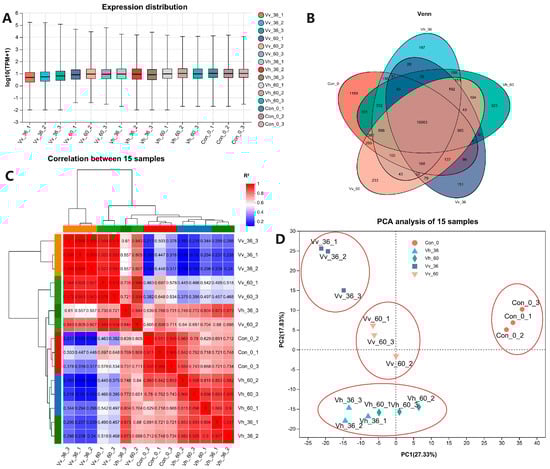 In this study, gene expression levels were quantified using Transcripts Per Kilobase per Million (TPM), and genes or mRNAs were classified as up- or down-regulated based on TPM values. A Venn diagram was used to illustrate the overlap of expressed genes among the five experimental groups. To identify differentially expressed genes (DEGs) under different treatments, gene expression profiles were compared across Vv_36 vs. Con, Vv_60 vs. Con, Vh_36 vs. Con, Vh_60 vs. Con, Vv_60 vs. Vv_36, Vh_60 vs. Vh_36, Vh_36 vs. Vv_36, and Vh_60 vs. Vv_60. DEGs were detected using DESeq2 with an adjusted p-value (padj) threshold of <0.05. The overall distribution of DEGs across the 15 samples was visualized using column and scatter plots. A heatmap was generated to represent the hierarchical clustering of DEGs based on log10(TPM + 1) values, with a specific example provided for the comparison Vv_36 vs. Con. Functional enrichment analysis was performed on DEGs from the Vh_36 vs. Vv_36 and Vh_60 vs. Vv_60. Gene Ontology (GO) term enrichment was analyzed using GOseq (version 1.34.1), which implements a Wallenius non-central hypergeometric distribution model. Kyoto Encyclopedia of Genes and Genomes (KEGG) pathway enrichment was assessed with KOBAS version 2.0 [89] via a hypergeometric test.