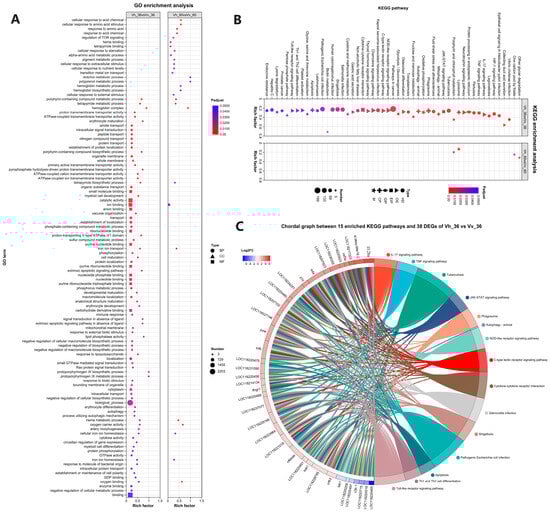 The 91 and 29 differential enrichment GO terms (A) and the 173 and 4 differential enrichment KEGG pathways (B) in two comparisons of Vh_36 vs. Vv_36 and Vh_60 vs. Vv_60 as well as the Chordal graph between 15 enriched KEGG pathways and 38 DEGs in Vh_36 vs. Vv_36 (C). (A) The type of BP, CC and MF indicates Biological Process, Cellular Component and Molecular Function; (B) the type of M, OS, HD, CP, GIP and EIP indicate Metabolism, Organismal Systems, Human Diseases, Cellular Processes, Genetic Information Processing and Environmental Information Processing in that order. (A,B) The vertical axis indicates the GO terms or KEGG pathways, and the horizontal axis indicates the rich factor ratio of regulated/background genes; the size of the dots indicates the number of genes, and the color of the dots indicate p adjust values.