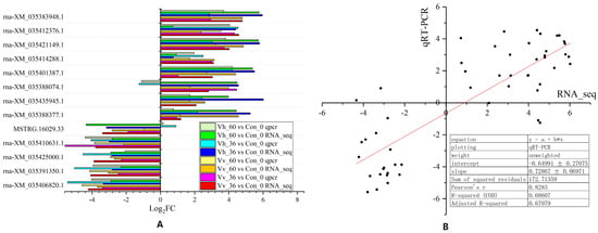 Of the 13 transcripts selected for validation, the fold-change values for 11 were consistent between qRT-PCR and RNA-seq across all four comparisons (Vv_36 vs. Con, Vv_60 vs. Con, Vh_36 vs. Con, and Vh_60 vs. Con). However, the regulation trends (up- or down-) of two transcripts (XM_035388074.1 and MSTRG.16029.33) observed by RNA-seq disagreed with those from qRT-PCR in the Vh_60 vs. Con and Vh_36 vs. Con comparisons (Figure 5A). A linear fit of the expression values for these transcripts revealed a strong correlation between the two methods, with a coefficient (slope) of 0.729 and a Pearson’s correlation coefficient of 0.828 (Figure 5B).