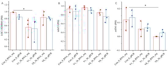 To validate the RNA-seq results, we selected 13 genes exhibiting a range of log2(fold change) (log2FC) values in TPM for further confirmation by quantitative real-time PCR (qRT-PCR). These genes were examined across four comparison groups: Vh_36 vs. Con, Vv_36 vs. Con, Vh_60 vs. Con, and Vv_60 vs. Con. QRT-PCR was performed using the RealUniversal Color PreMix (SYBR Green, Tiangen, Beijing, China) on a LightCycler® 480 instrument (Roche, Wilmington, MA, USA). First-strand cDNA synthesized from the RNA samples served as the template. Gene-specific primers were designed for each of the 13 target genes (Table 5), with β-actin used as an internal reference gene for normalization. Sample preparation and amplification procedures followed the protocol described by He et al. [14]. The amplification program consisted of 45 cycles of 95 °C for 10 s, 60 °C for 15 s, and 72 °C for 20 s. Each sample was run in triplicate. The relative expression levels of the target genes were calculated using the 2−ΔΔCT method, expressed as log2(2−ΔΔCT) = −ΔΔCT. These qRT-PCR results were then compared with the log2FC values obtained from the RNA-seq analysis for the same four comparisons to assess consistency between the two methods.