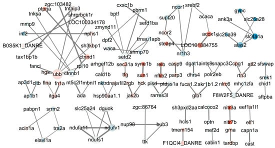 Protein–protein interaction (PPI) analysis was performed on the 466 common DASs of Vh_36 vs. Vv_36_DAS and Vh_60 vs. Vv_60_DAS, revealing interactions between 119 of the encoded proteins (Supplementary Table S6). These 119 proteins formed 33 networks with a total of 91 interaction degrees (Figure 9). Although only 43 and 9 of these DASs were also identified as DEGs in the two respective comparisons, their alternative splicing was significant (FDR < 0.05). Notably, the proteins encoded by ubb, setd2, ctnnb1, ndufs1, and ndufv1 were hub nodes, directly interacting with 7, 5, 4, 4, and 4 other proteins, respectively. The proteins encoded by nr1h3, alas2, and slc4a1a each interacted with 3 other proteins.