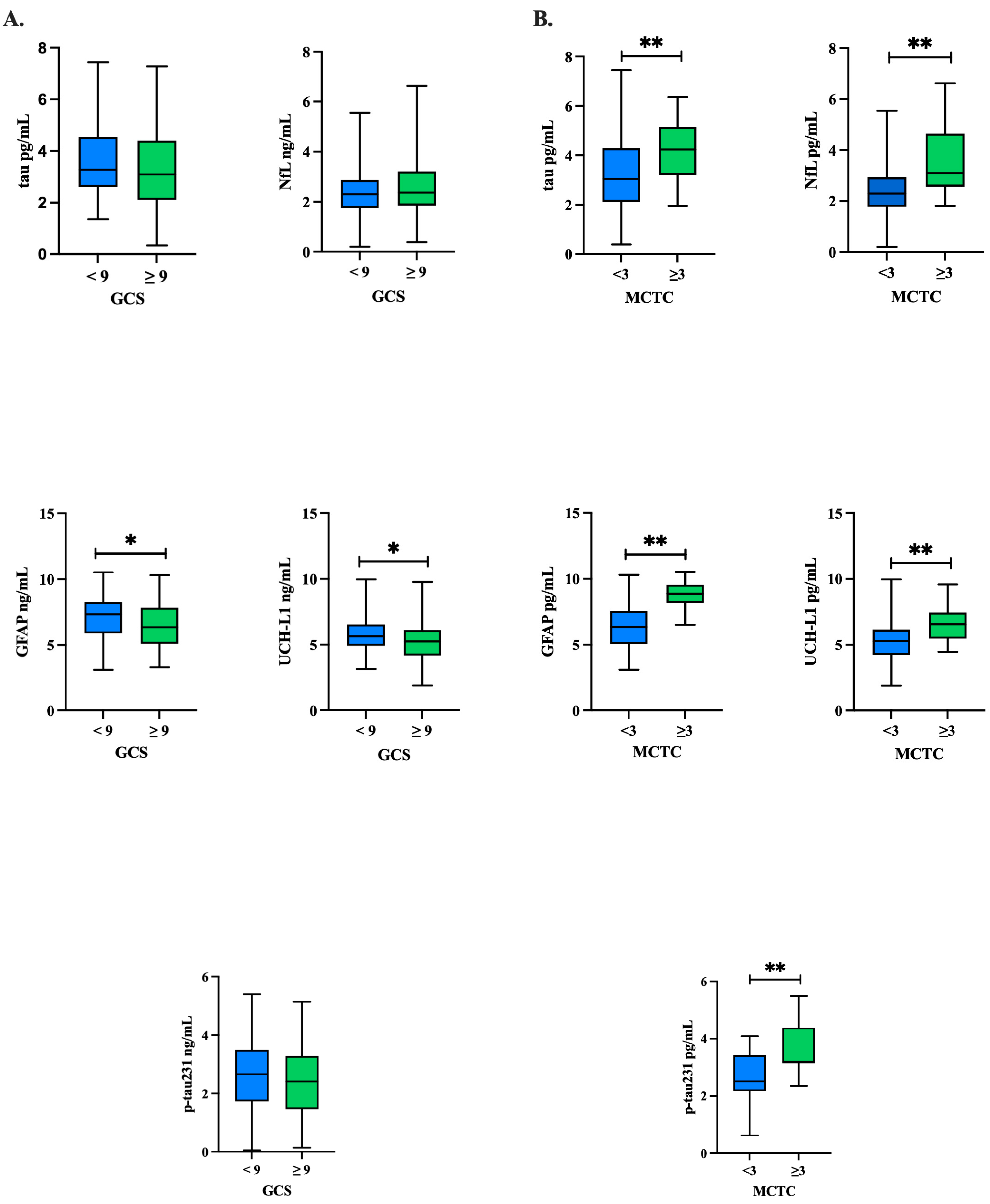 Specifically, the findings that higher plasma concentrations of GFAP, NfL, and p-tau231 measured within one hour of moderate-to-severe TBI were associated with an MCTC score ≥ 3, but not with GCS, suggest that these markers may reflect early structural injury detectable on neuroimaging. Our findings are consistent with prior work examining GFAP, UCH-L1, NfL, and tau in relation to GCS and Marshall CT classification (MCTC) in acute TBI patients [