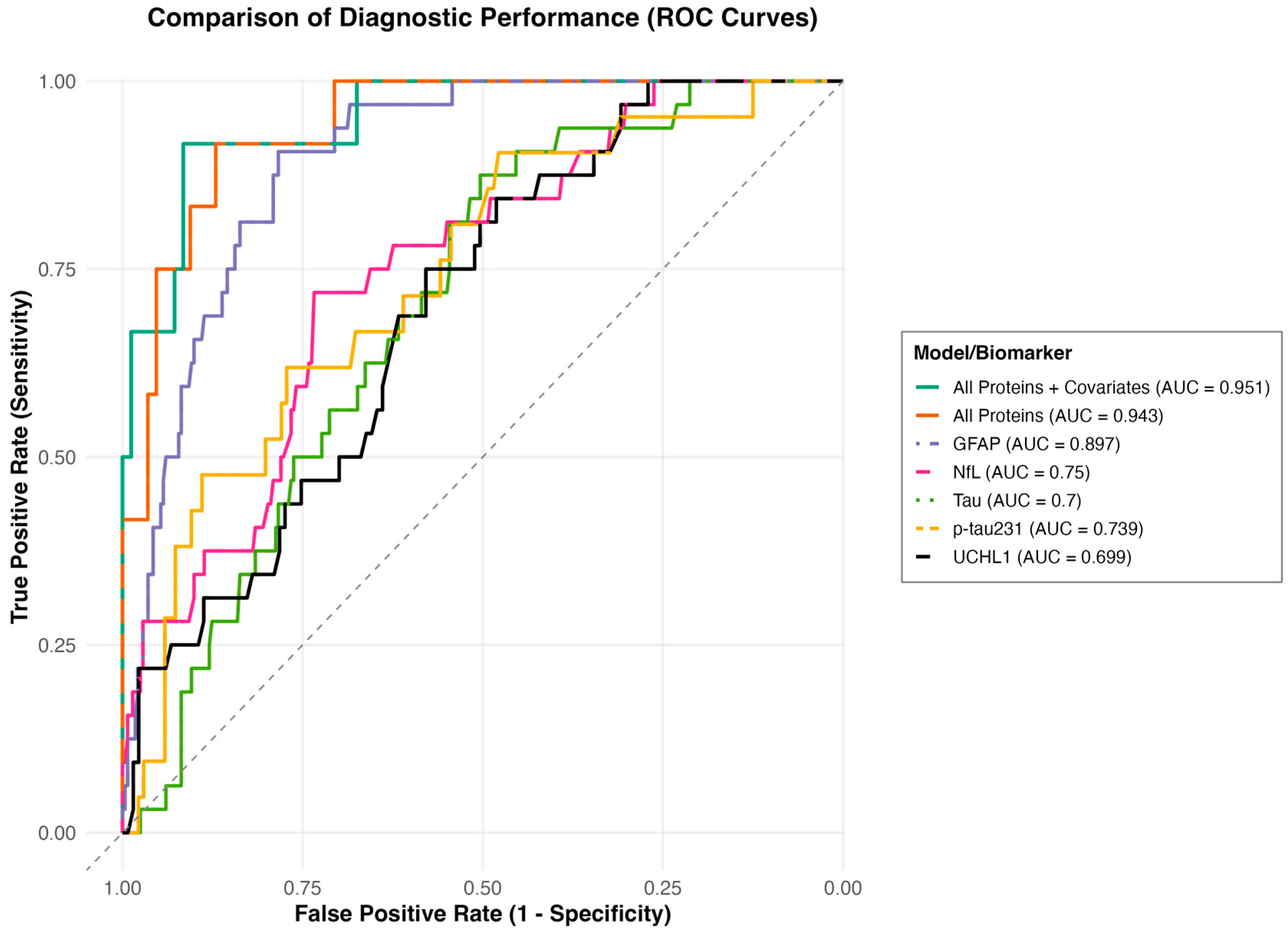 Figure 2). In stratifying MCTC ≥ 3 vs. <3, GFAP, NfL, tau, and p-tau231 significantly predicted MCTC ≥ 3 group and had fair to good AUC values [GFAP (AUC 0.897, 95% CI 0.853–0.940); NfL (AUC 0.75, 95% CI 0.666–0.834); tau (AUC 0.7, 95% CI 0.621–0.780); p-tau231 (AUC 0.739, 95% CI 0.627–0.852)]. The combined proteins model showed good discriminatory ability to predict MCTC ≥ 3 group (AUC 0.943, 95% CI 0.888–0.998), and the combined proteins and covariates model showed good ability to predict the MCTC ≥ 3 group (AUC 0.951, 95% CI 0.894–1.000).