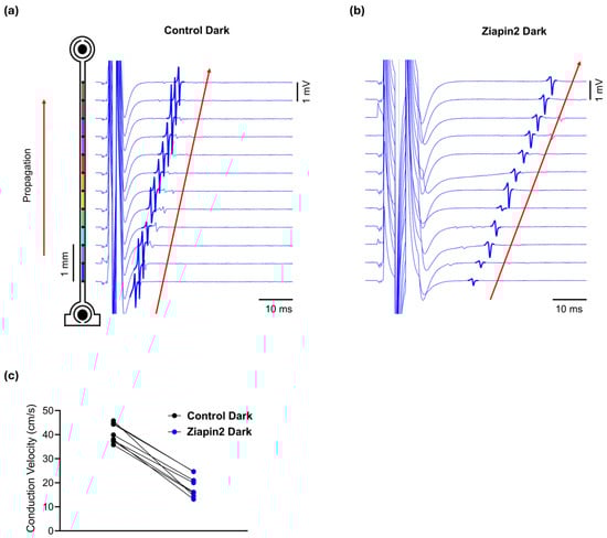 Ziapin2 reduces conduction velocity (CV) in cardiac strands in the dark. Representative extracellular field potential traces from MEA electrodes recorded before (a) and after Ziapin2-treatment (b) in a cultured strand electrically paced in the dark. Traces are vertically aligned according to electrode position along the series of electrodes (schematic on the left). In the presence of Ziapin2, a slower activation sequence was observed, with increased latency and reduced slope of field potential deflections consistent with decreased CV from 44.1 to 25.2 cm/s. (c) CV under dark conditions in Control and Ziapin2-treated strands. Data represents the CV measured in cardiac strands before light stimulation, showing a reduction in conduction speed upon Ziapin2 treatment compared to control.