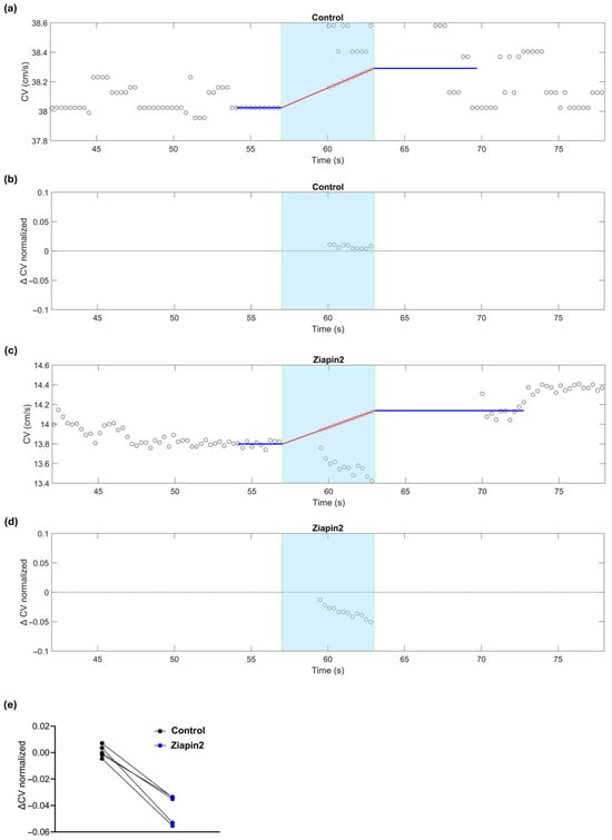 Effects of continuous light stimulation on CV in a cardiac strand before (control) and after Ziapin2-treatment. The cyan background marks the light exposure window (continuous light, 6 s). (a) CV as a function of time before Ziapin2 application. The blue lines represent the average/extrapolation of CV before and after illumination, respectively. The red line represents the linear interpolation of the CV trend during illumination (thermal effects). This extrapolation and interpolation of CV was necessary because turning the illumination on and off caused a transient (3–4 s) drift of the field potential that resulted in saturation of the amplifiers, which precluded CV measurement. (b) CV variation relative to the thermal prediction in the same strand, showing no significant deviation during illumination from the predicted interpolation. (c) Same as in panel (a) in the same strand after Ziapin2 treatment. Despite the thermal prediction indicating an increase in CV, a transient decrease was observed during light exposure relative to the interpolation line. (d) CV variation in the same Ziapin2-treated strand, showing a clear negative deflection from the thermal prediction during illumination, consistent with a photo-induced decrease of CV. (e) Data represents the ΔCV (relative to the interpolation of the thermal prediction) measured in cardiac strands subjected to continuous (6 s) light stimulation.