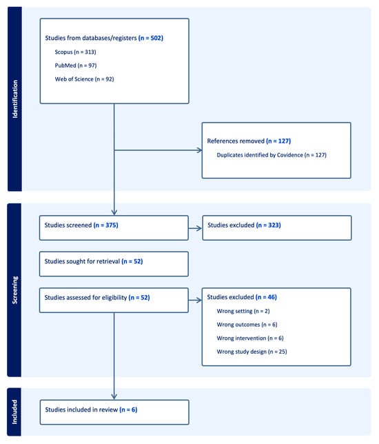 PRISMA flow diagram of study selection. A total of 502 records were identified through database searches. After removal of 127 duplicates, 375 unique articles were screened by title and abstract, with 323 excluded. Fifty-two full texts were assessed for eligibility; 46 did not meet inclusion criteria. In total, six studies fulfilled the eligibility.
