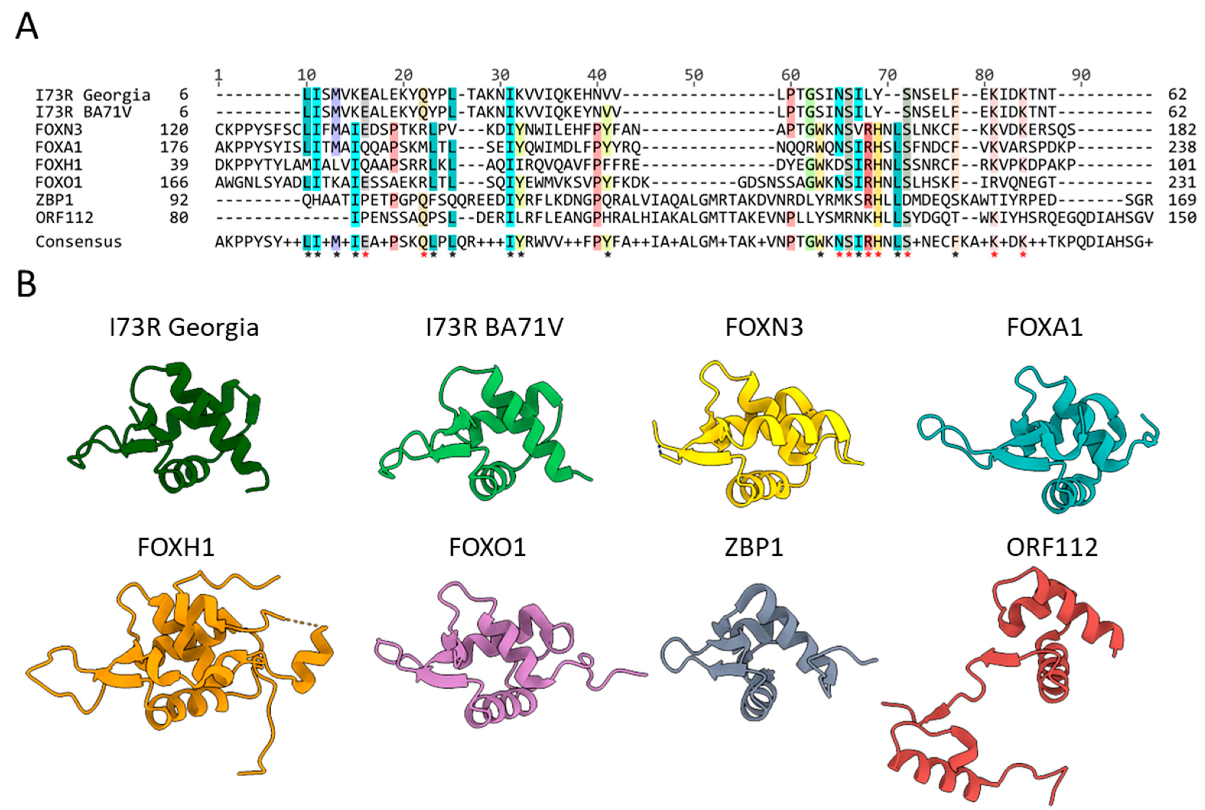 Figure 2. Overall structural and sequence comparison between pI73R and known Z-DNA interactors, including FOX family proteins. (A) Multi sequence alignment (MSA) of the pI73R amino acid sequence with those of structurally homologous FOX family proteins and Z-DNA interactors. Positions of conserved amino acids (≥50%) across sequences are highlighted and a MSA-based consensus is given below. (B) Aligned protein structures of I73R Georgia (PDB: 7VWV), I73R BA71V (prediction), FOXN3 (PDB: 6NCM), FOXA1 (PDB: 7VOX), FOXH1 (PDB: 7YZB), FOXO1 (PDB: 3CO7), ZBP1 (PDB: 3EYI), and ORF112 (PDB: 4HOB). Consensus positions with hydrophobic or hydrophilic amino acid residues are marked with black and red asterisks, respectively.